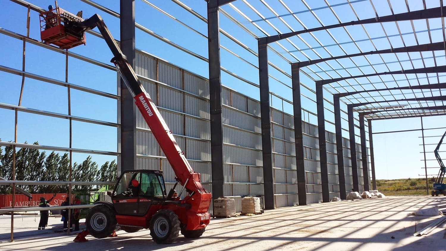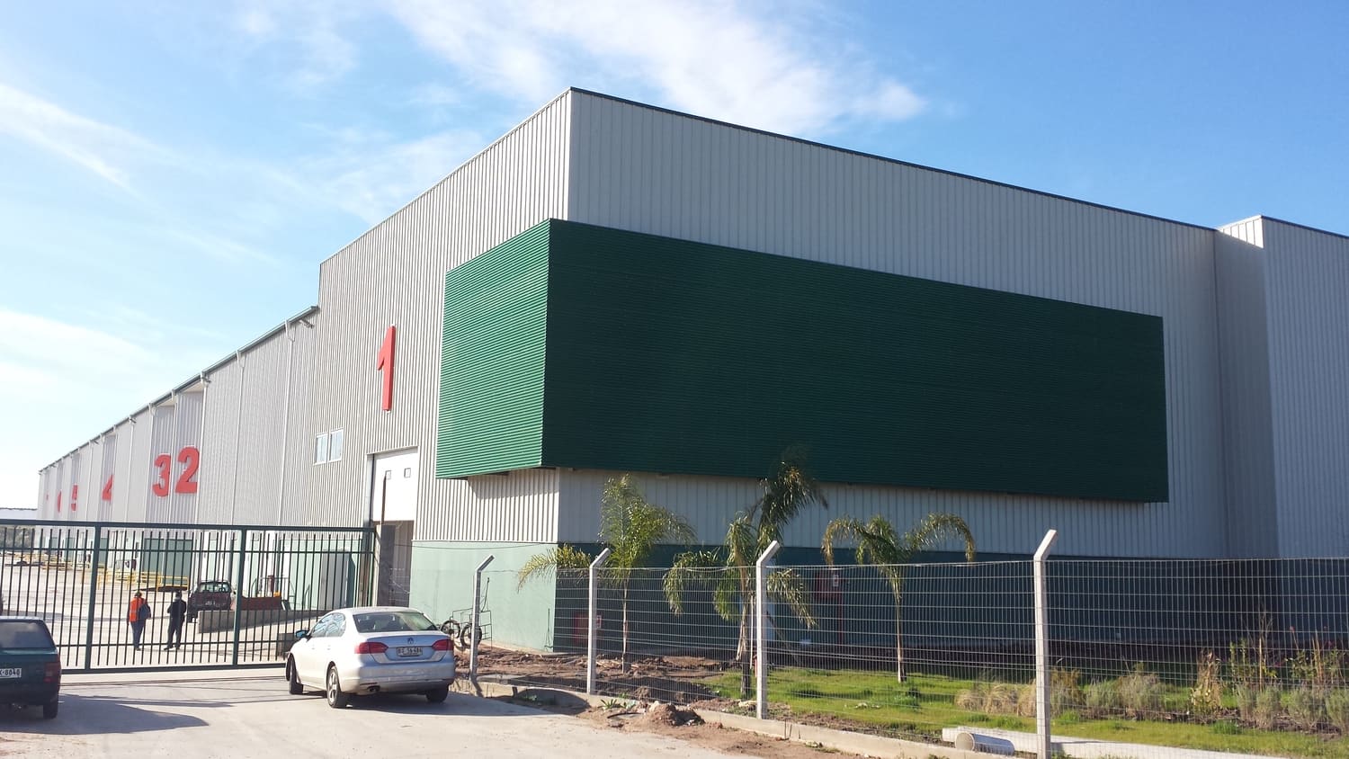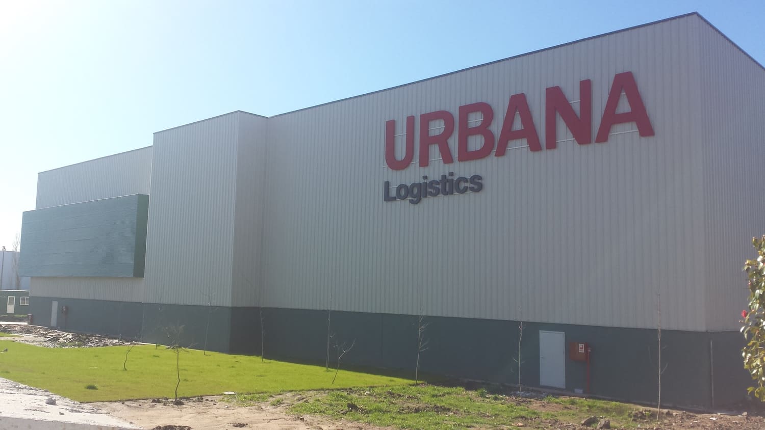 Edificio de uso industrial. El diseño arquitectónico es funcional y sencillo, con líneas rectas y un revestimiento metálico que sugiere durabilidad y bajo mantenimiento. La estructura presenta una apariencia robusta, con volúmenes cúbicos y una fachada de colores neutros que contrasta con el rojo del letrero. La base del edificio está pintada en un tono más oscuro, probablemente para disimular la suciedad y el desgaste. El área exterior está bien cuidada, con césped y pequeños árboles plantados, lo que añade un toque de verde y contribuye a un entorno más agradable y ecológico.