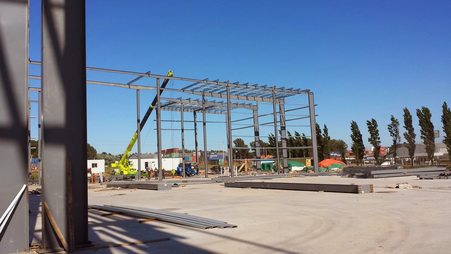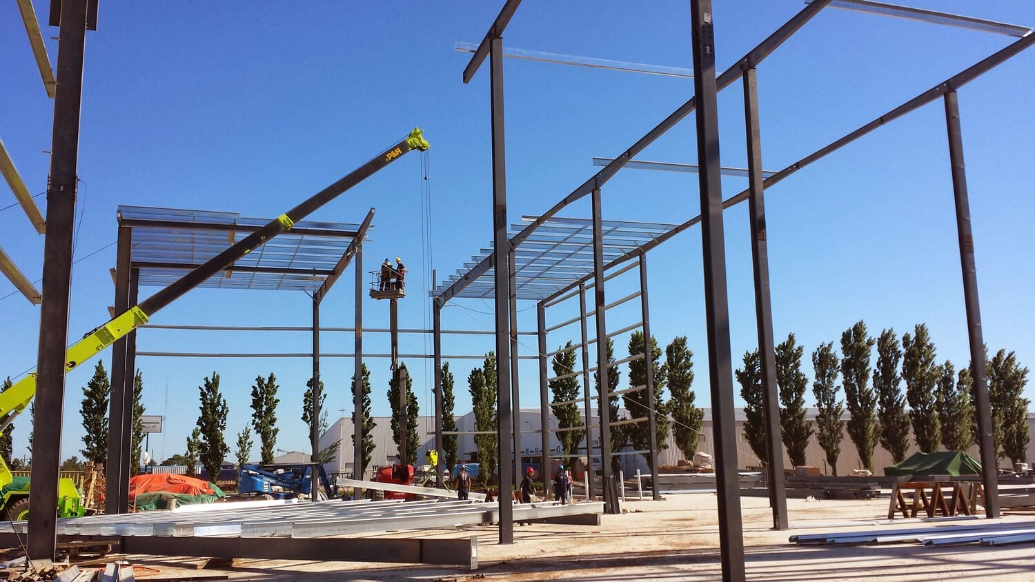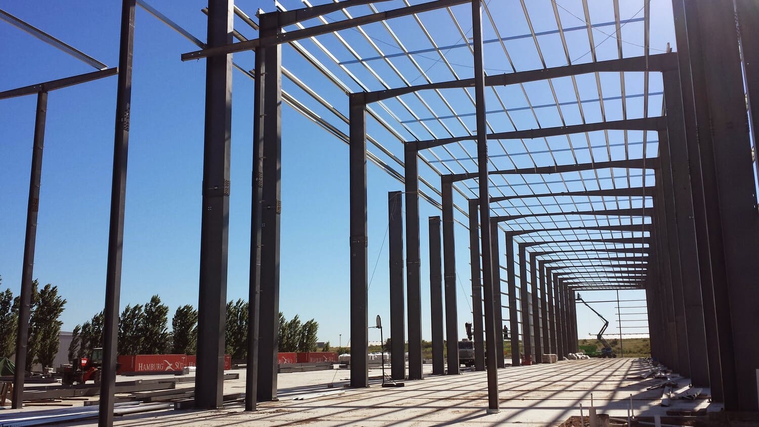 Edificio de uso industrial. El diseño arquitectónico es funcional y sencillo, con líneas rectas y un revestimiento metálico que sugiere durabilidad y bajo mantenimiento. La estructura presenta una apariencia robusta, con volúmenes cúbicos y una fachada de colores neutros que contrasta con el rojo del letrero. La base del edificio está pintada en un tono más oscuro, probablemente para disimular la suciedad y el desgaste. El área exterior está bien cuidada, con césped y pequeños árboles plantados, lo que añade un toque de verde y contribuye a un entorno más agradable y ecológico.