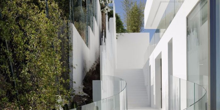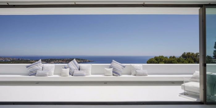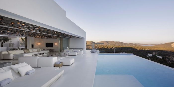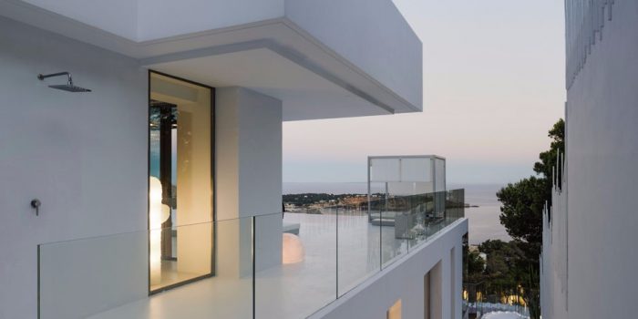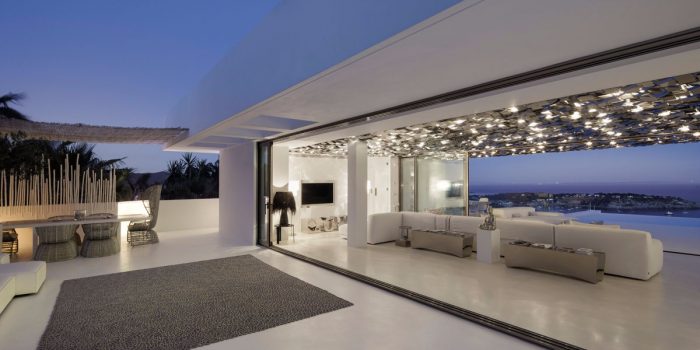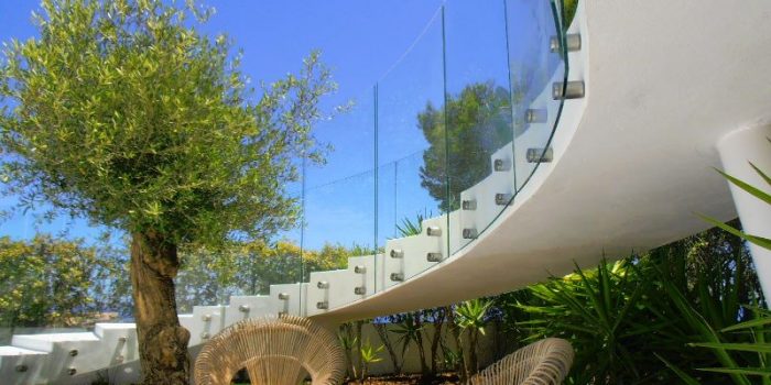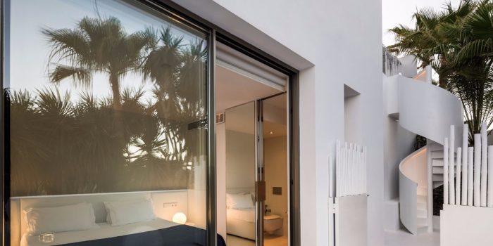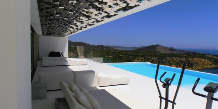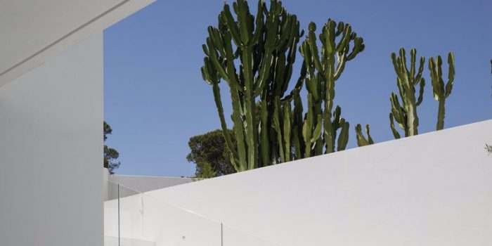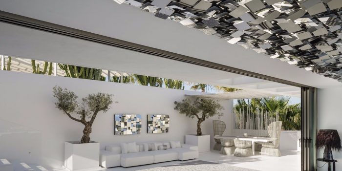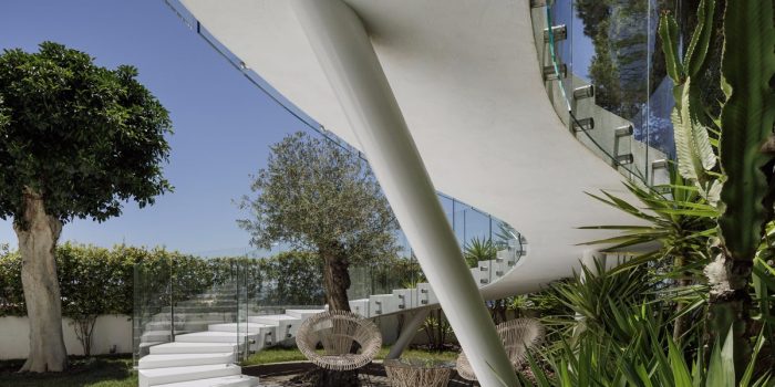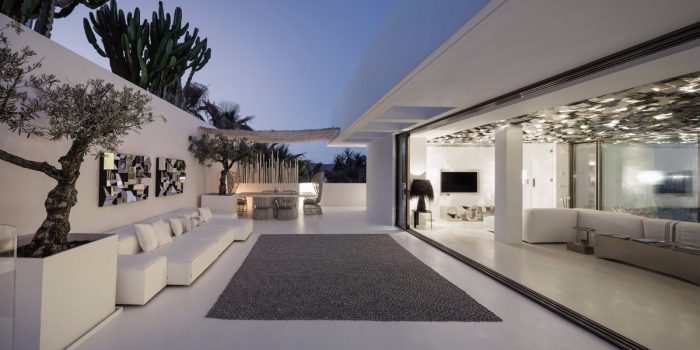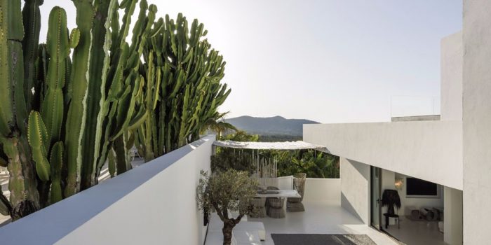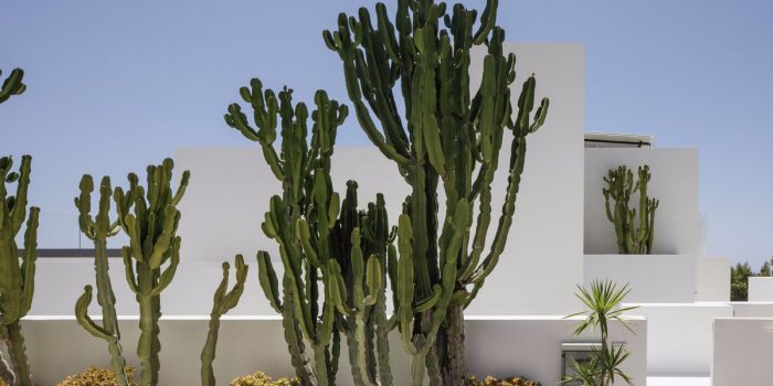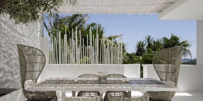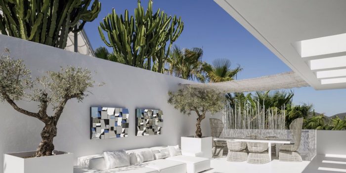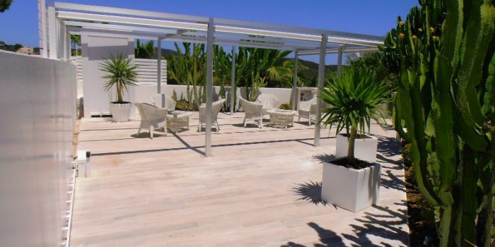 Estética minimalista y mediterránea. Destaca una pérgola de líneas rectas y modernas, hecha de metal blanco que proporciona sombra parcial a la zona de asientos. El suelo es de madera clara, lo que añade calidez y contraste con el blanco predominante. Los muebles de exterior, también en tonos blancos, consisten en sillas y mesas de diseño contemporáneo, promoviendo un ambiente relajado y sofisticado. La vegetación, con plantas tropicales y cactus en macetas blancas geométricas, aporta un toque natural y refrescante, complementando perfectamente el entorno limpio y luminoso del espacio.