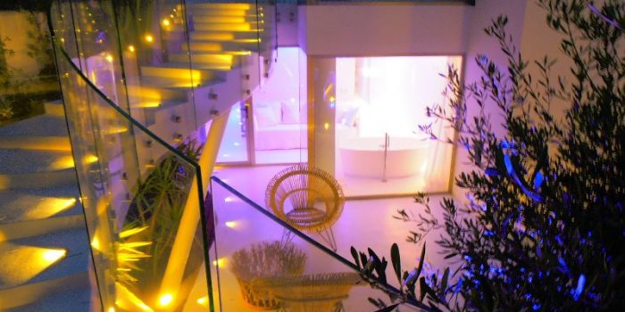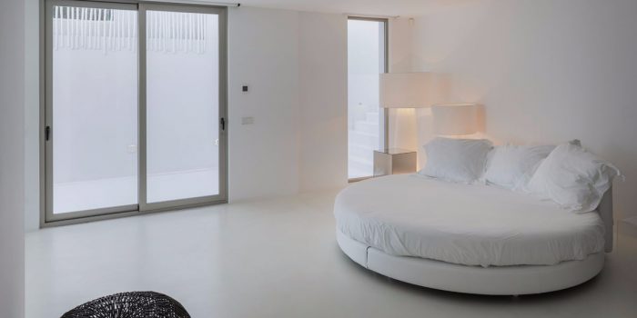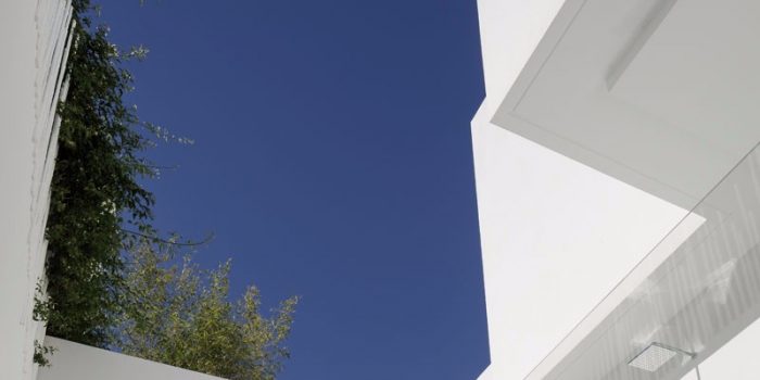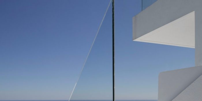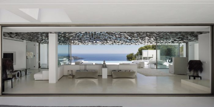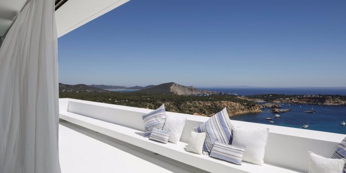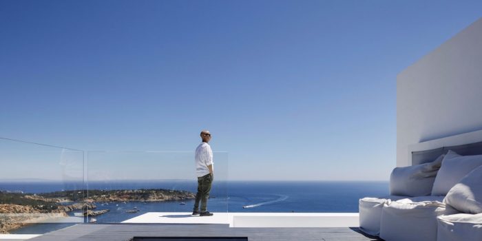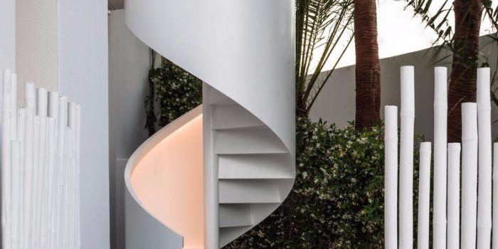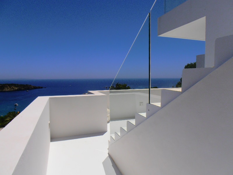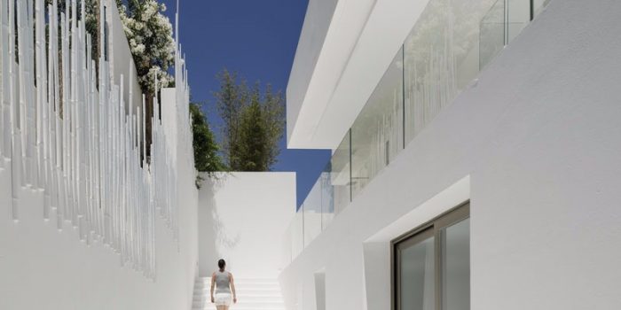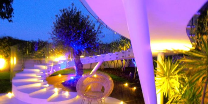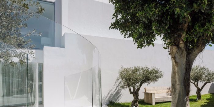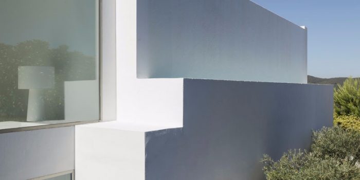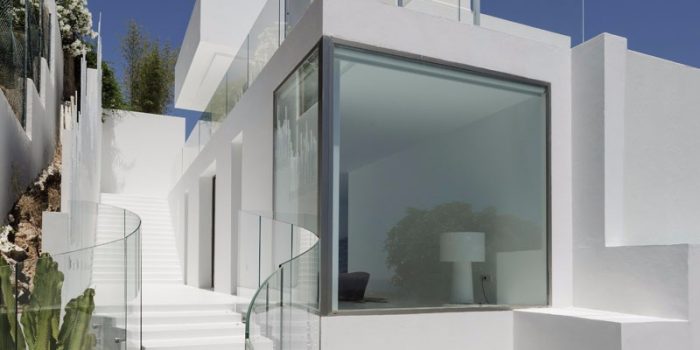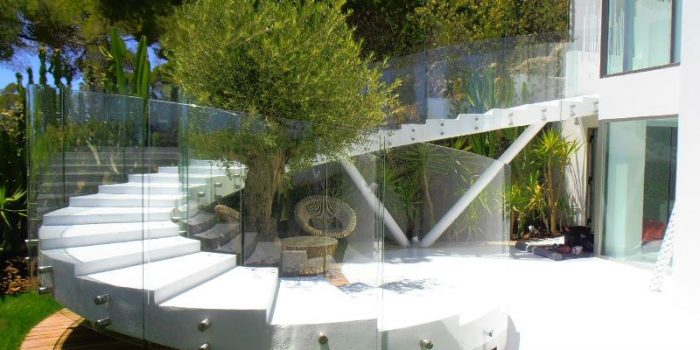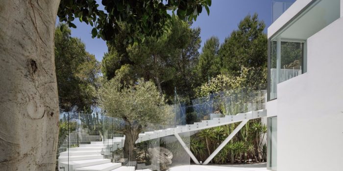 Estética minimalista y mediterránea. Destaca una pérgola de líneas rectas y modernas, hecha de metal blanco que proporciona sombra parcial a la zona de asientos. El suelo es de madera clara, lo que añade calidez y contraste con el blanco predominante. Los muebles de exterior, también en tonos blancos, consisten en sillas y mesas de diseño contemporáneo, promoviendo un ambiente relajado y sofisticado. La vegetación, con plantas tropicales y cactus en macetas blancas geométricas, aporta un toque natural y refrescante, complementando perfectamente el entorno limpio y luminoso del espacio.