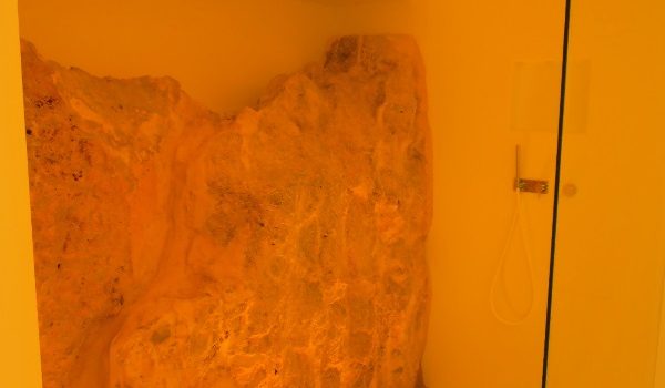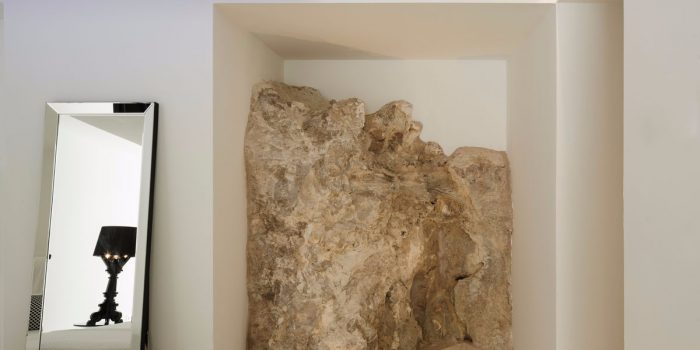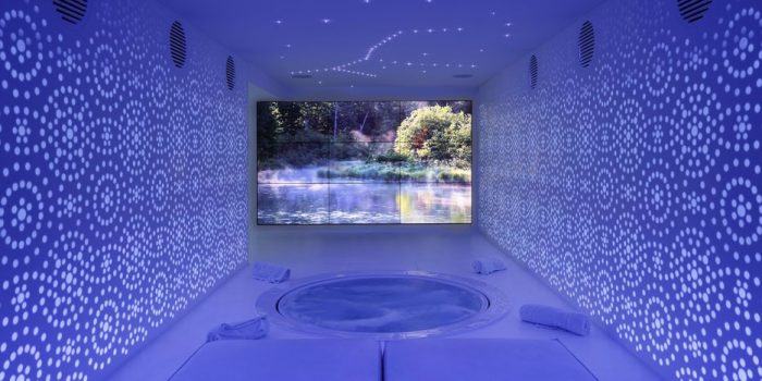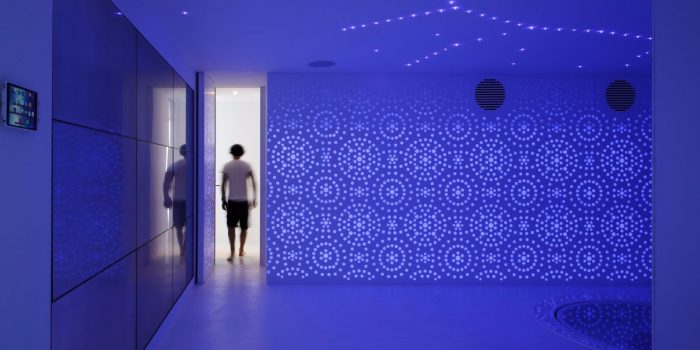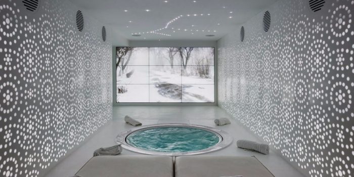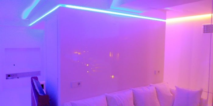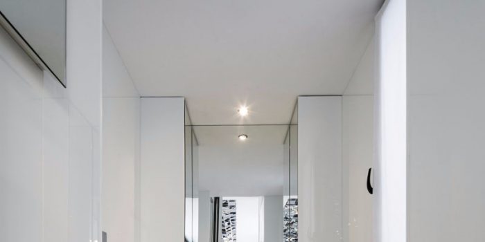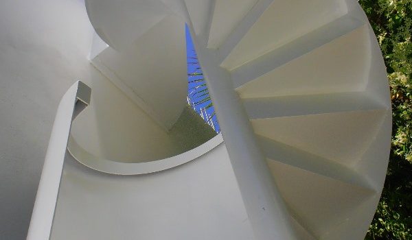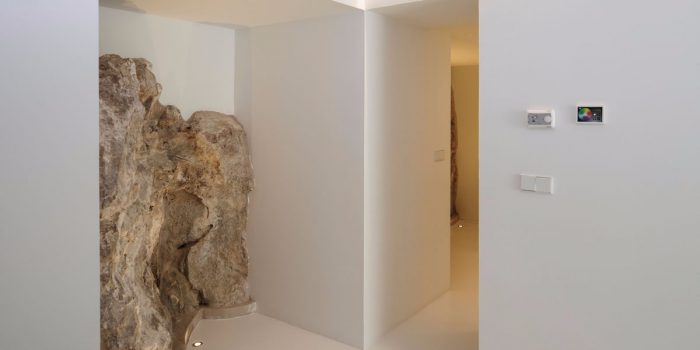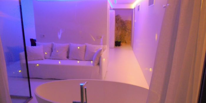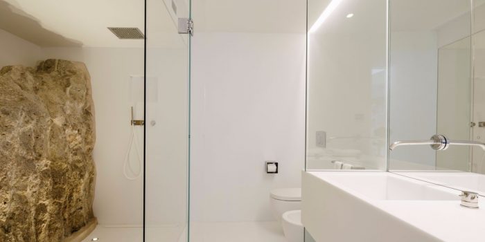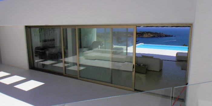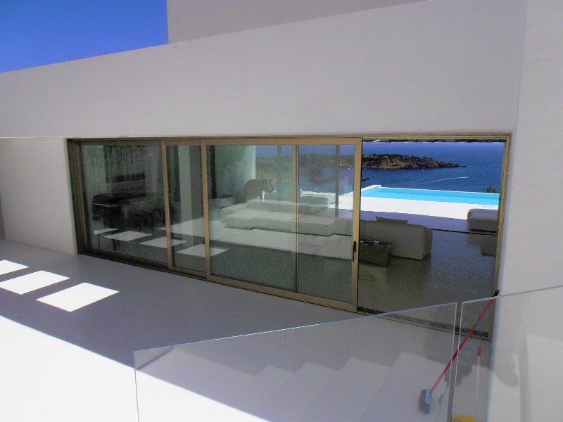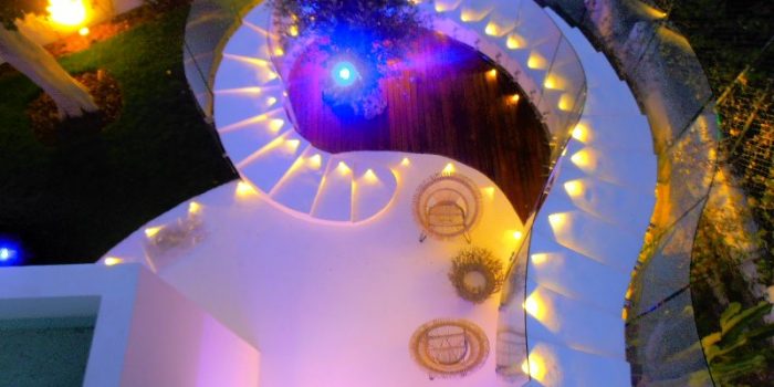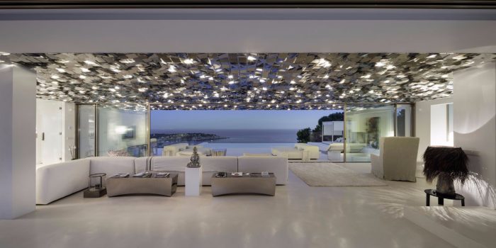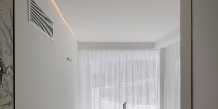 Estética minimalista y mediterránea. Destaca una pérgola de líneas rectas y modernas, hecha de metal blanco que proporciona sombra parcial a la zona de asientos. El suelo es de madera clara, lo que añade calidez y contraste con el blanco predominante. Los muebles de exterior, también en tonos blancos, consisten en sillas y mesas de diseño contemporáneo, promoviendo un ambiente relajado y sofisticado. La vegetación, con plantas tropicales y cactus en macetas blancas geométricas, aporta un toque natural y refrescante, complementando perfectamente el entorno limpio y luminoso del espacio.