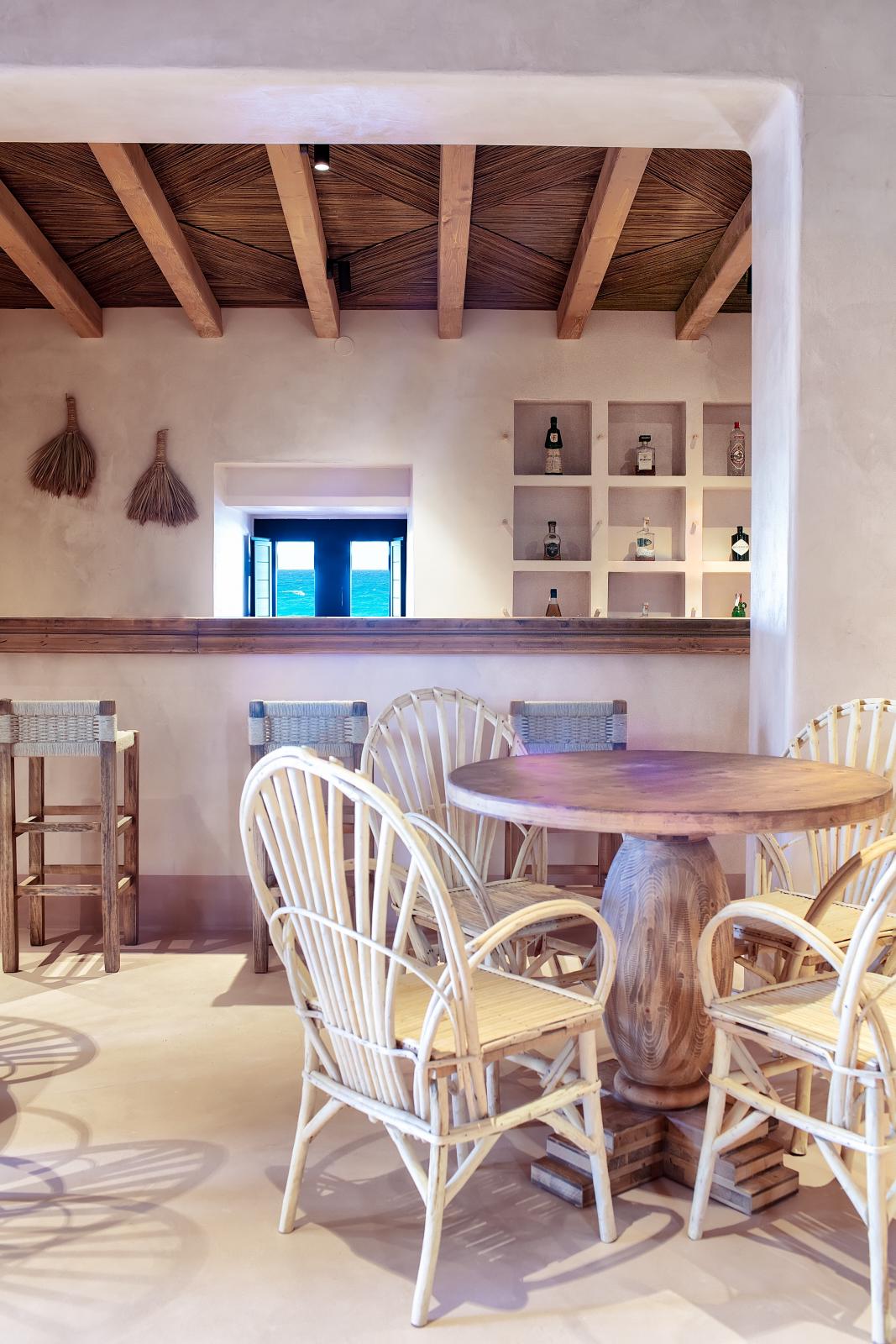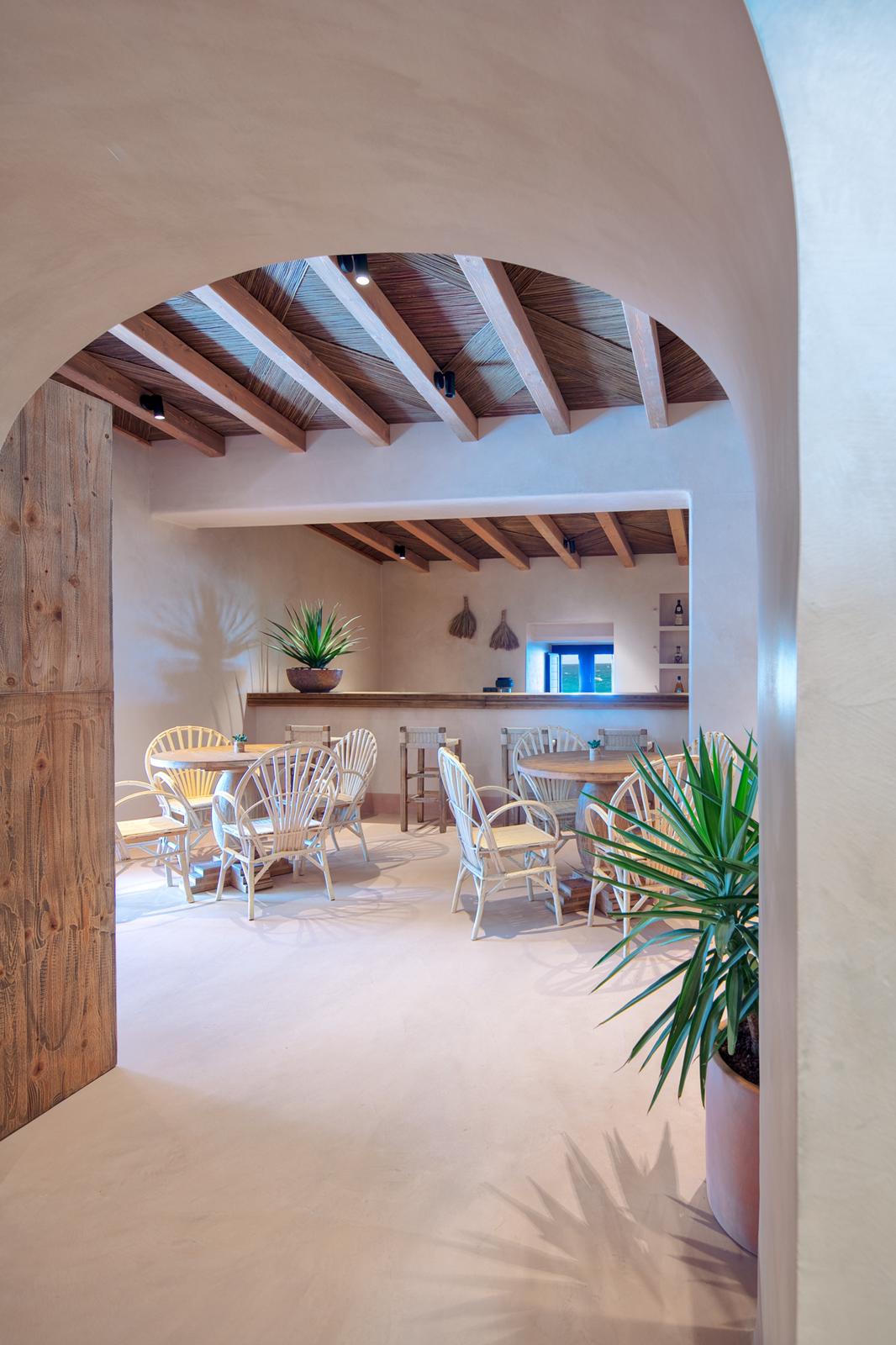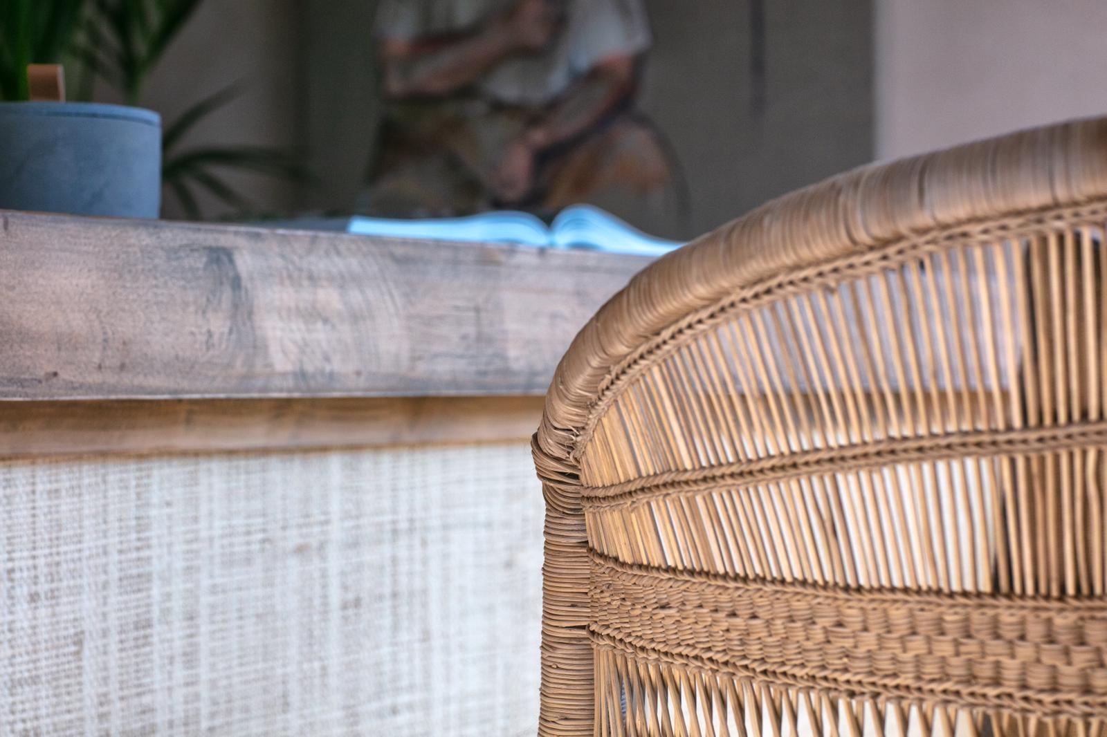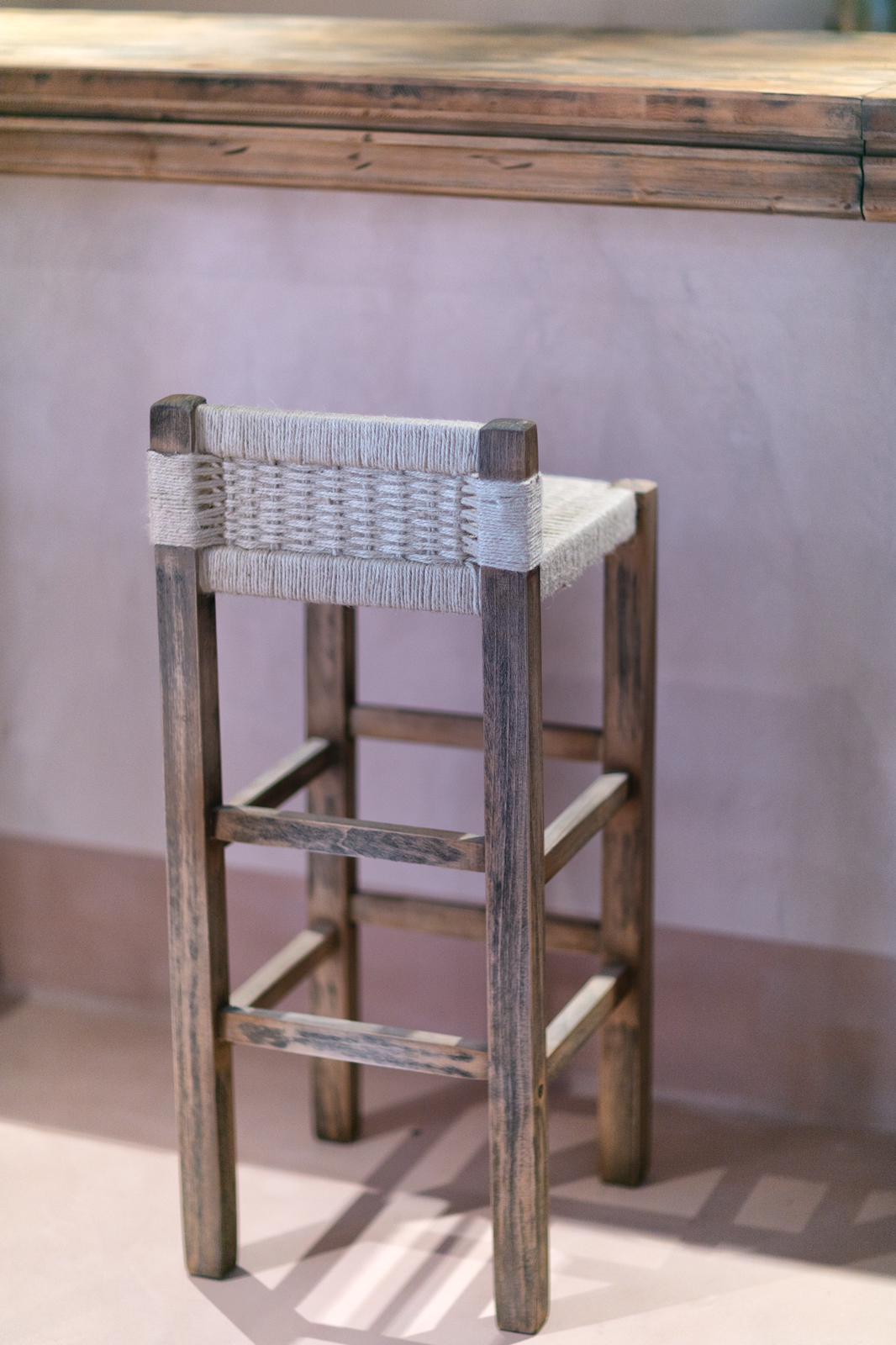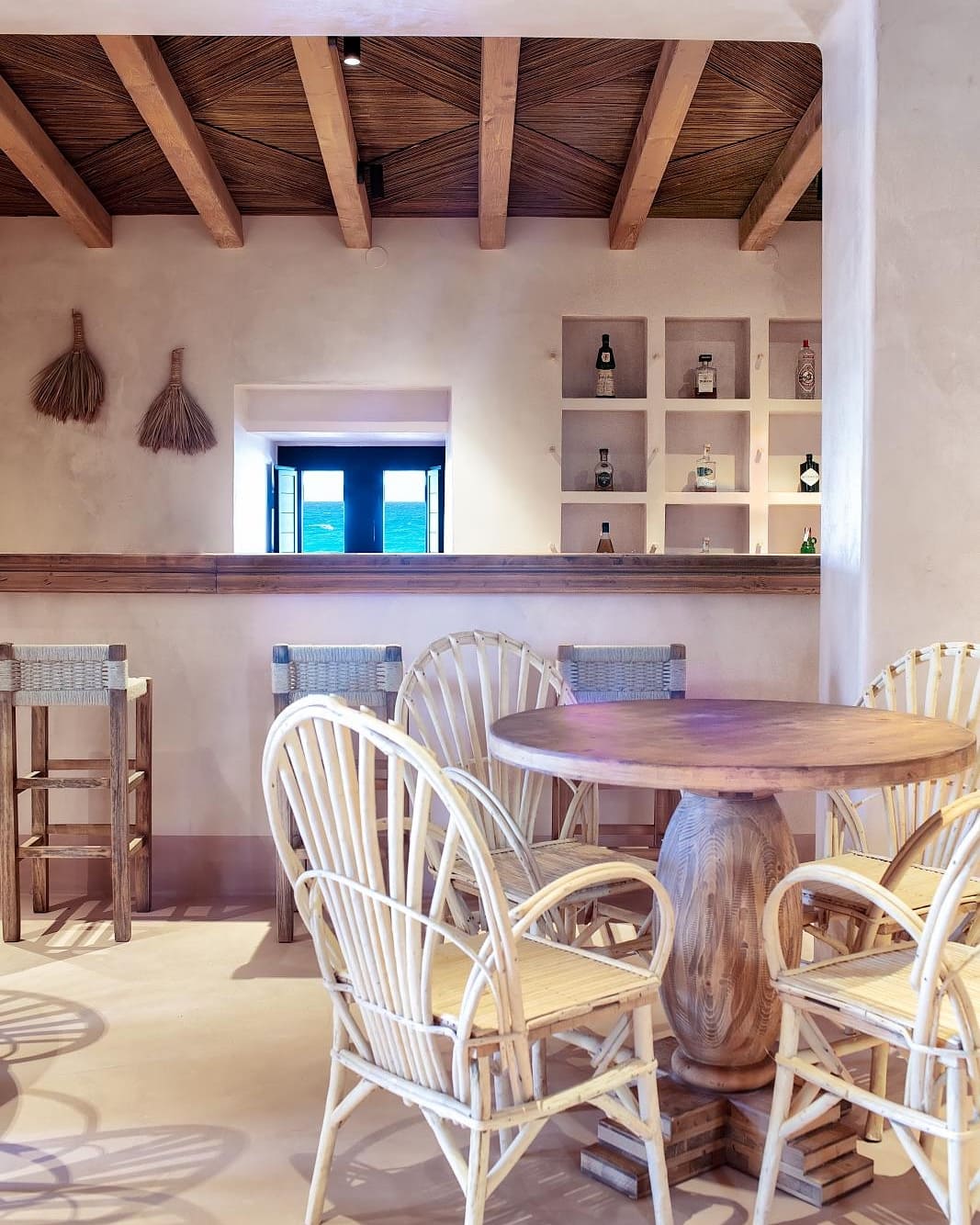 Espacio interior de diseño rústico y acogedor, caracterizado por el uso predominante de materiales naturales como la madera y el mimbre. El techo de vigas de madera expuestas añade un toque tradicional, mientras que las sillas de diseño entrelazado y las mesas de madera complementan la atmósfera cálida del lugar.