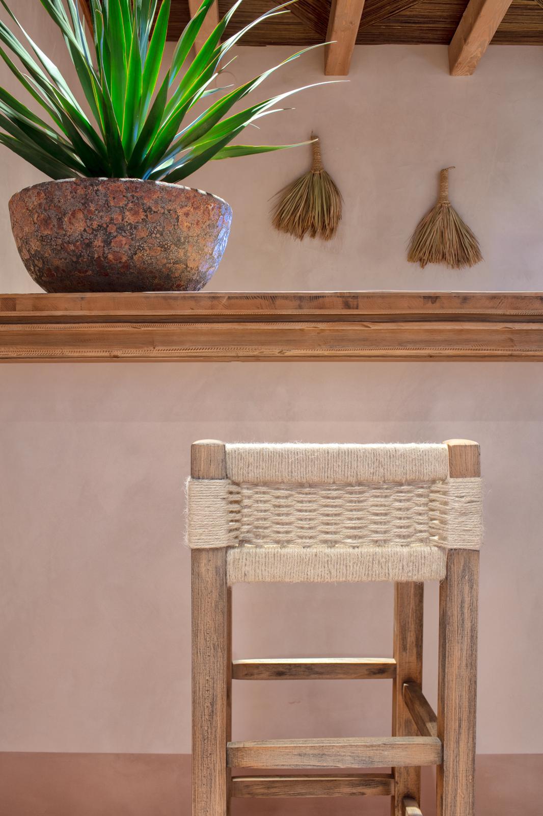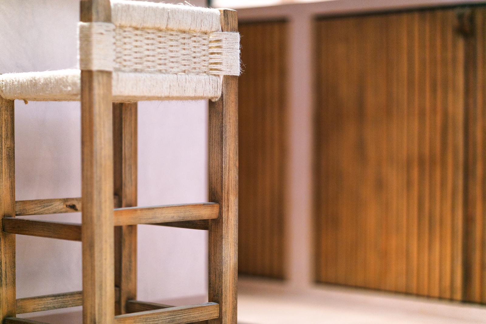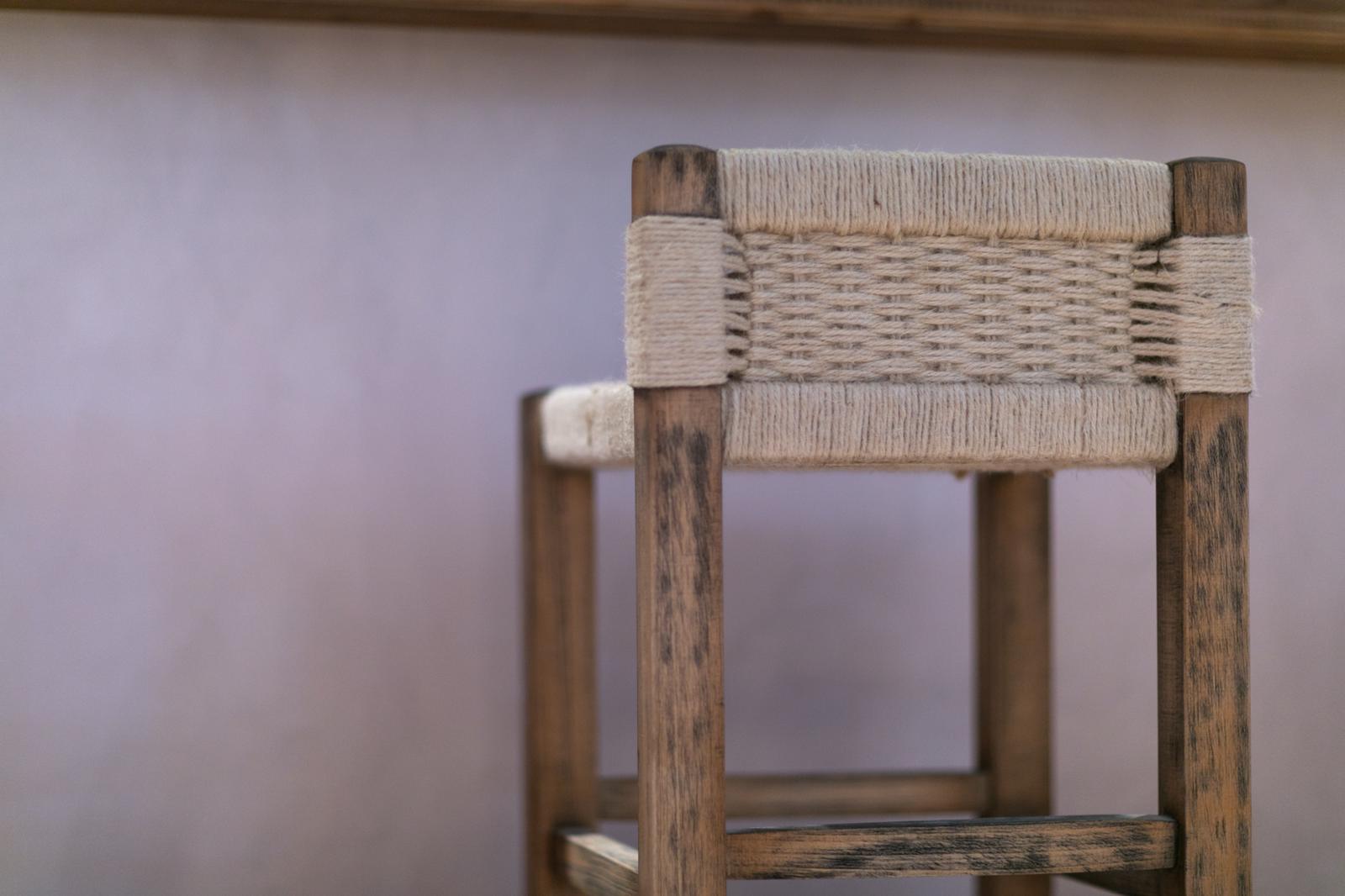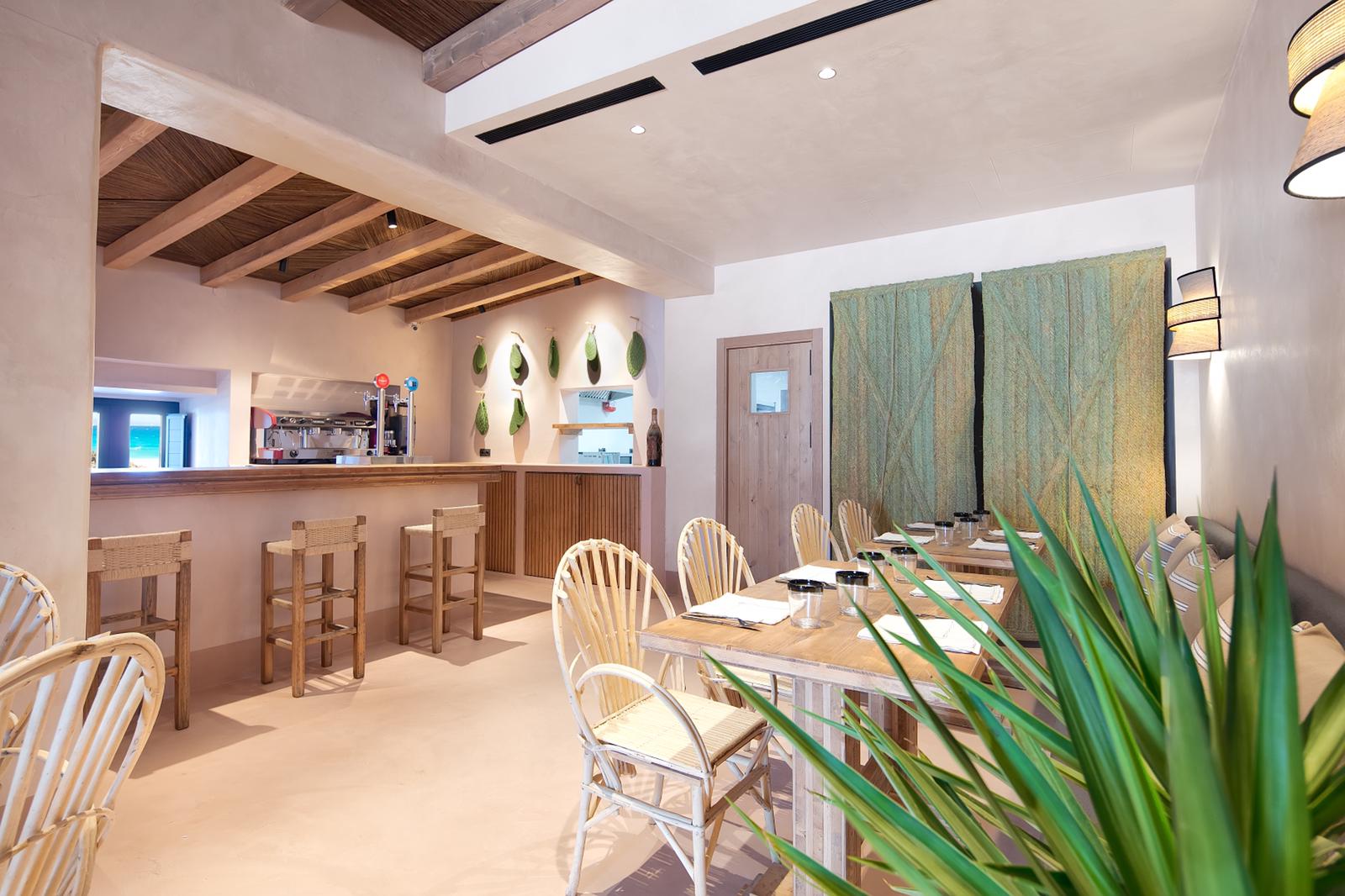 Espacio interior de diseño rústico y acogedor, caracterizado por el uso predominante de materiales naturales como la madera y el mimbre. El techo de vigas de madera expuestas añade un toque tradicional, mientras que las sillas de diseño entrelazado y las mesas de madera complementan la atmósfera cálida del lugar.