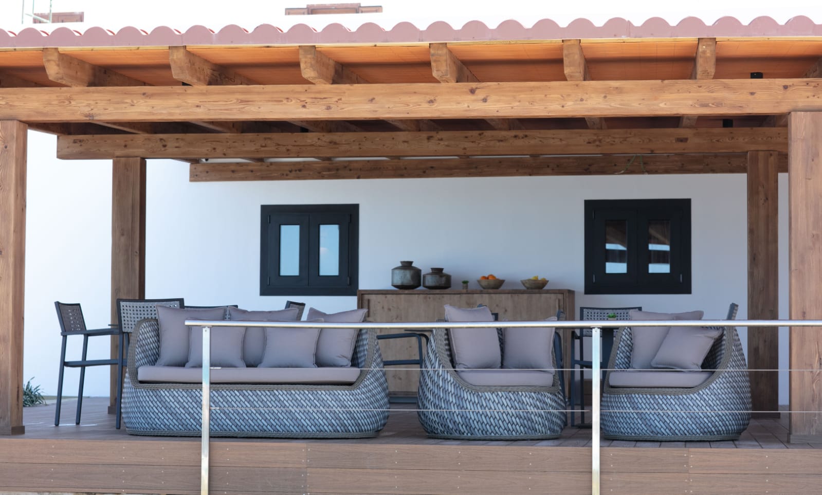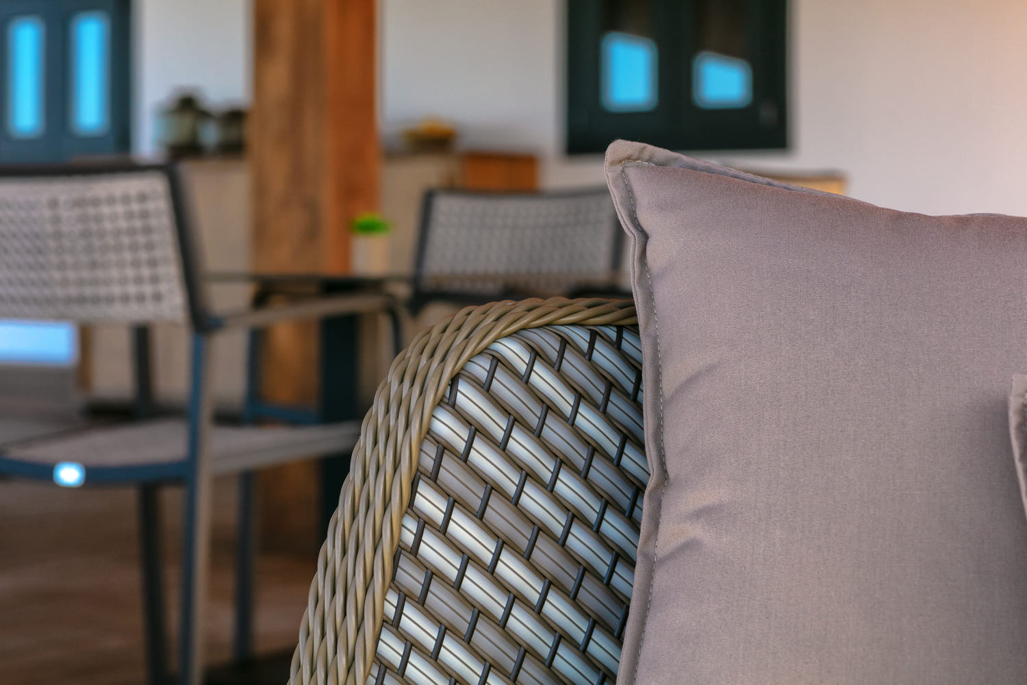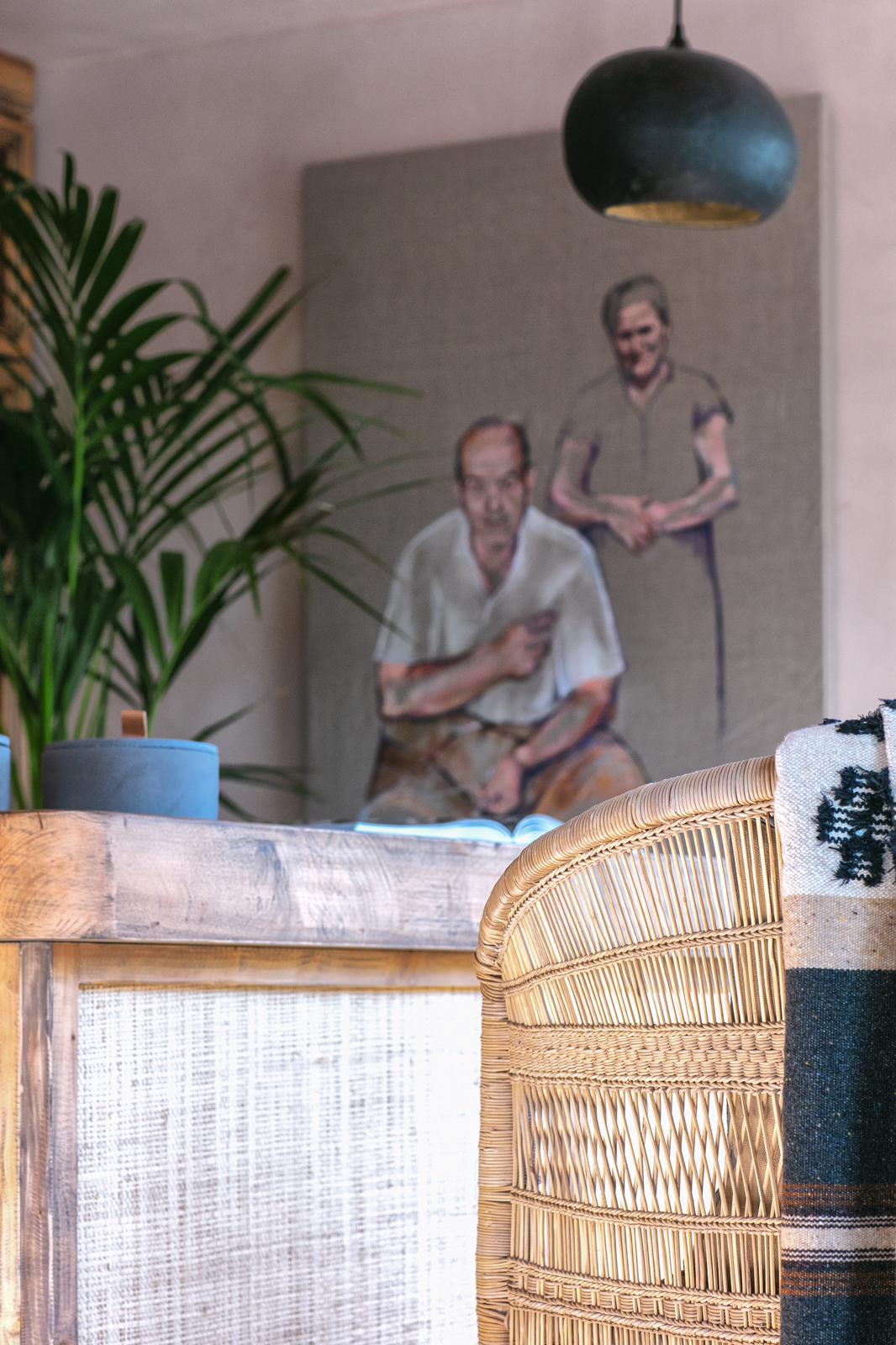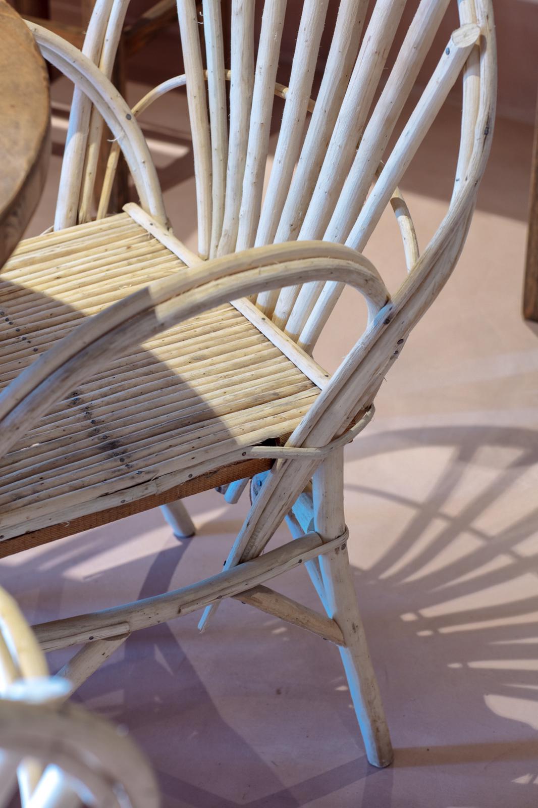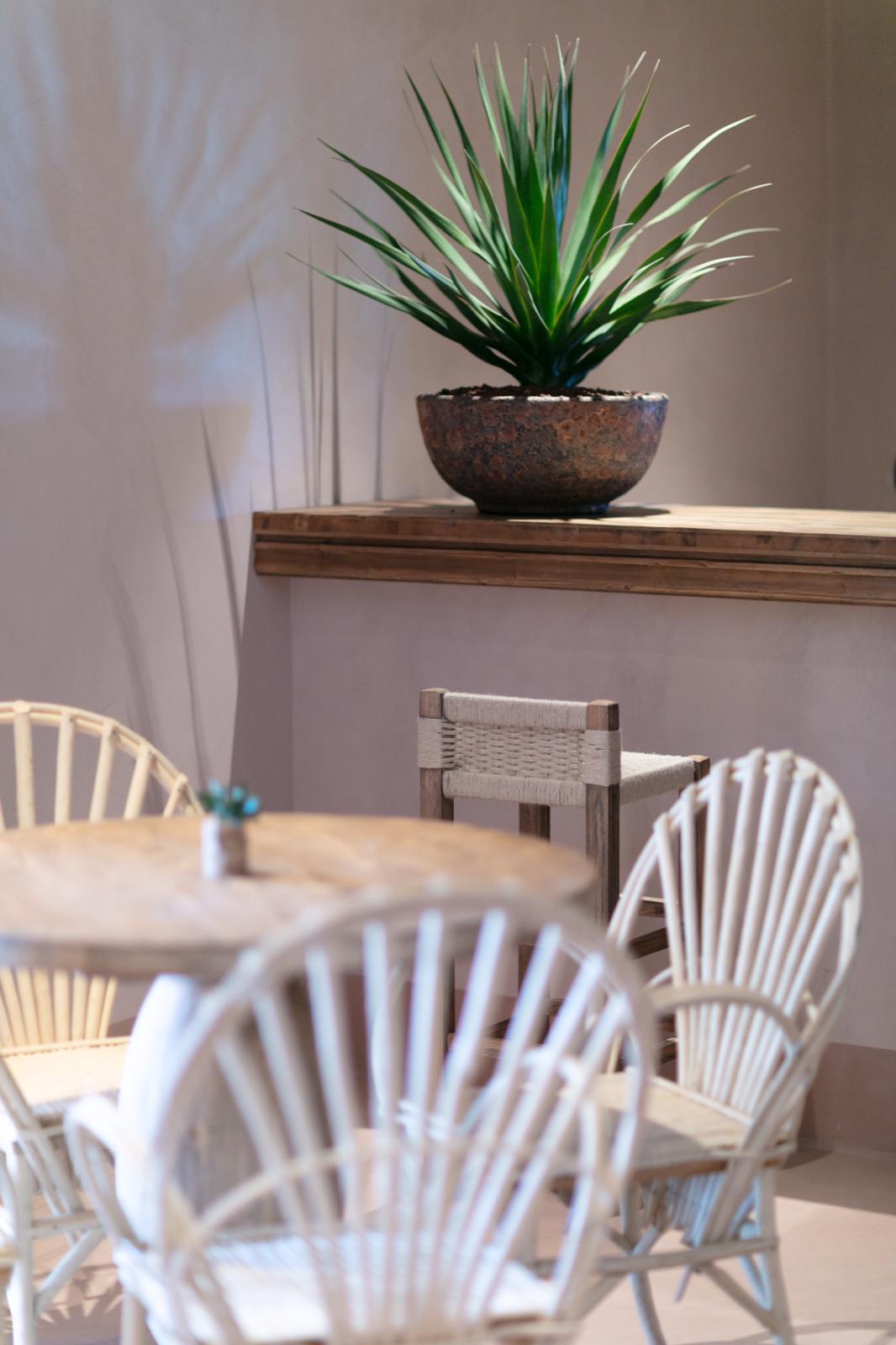 Espacio interior de diseño rústico y acogedor, caracterizado por el uso predominante de materiales naturales como la madera y el mimbre. El techo de vigas de madera expuestas añade un toque tradicional, mientras que las sillas de diseño entrelazado y las mesas de madera complementan la atmósfera cálida del lugar.