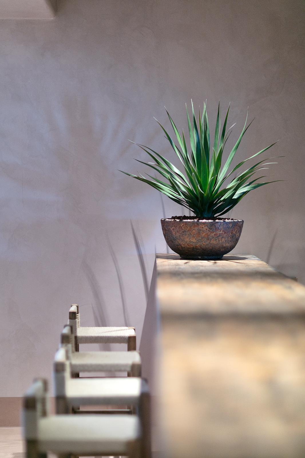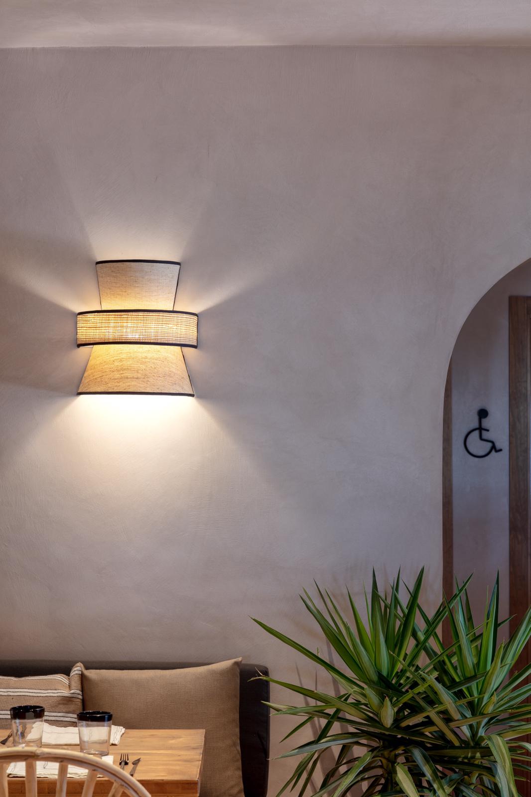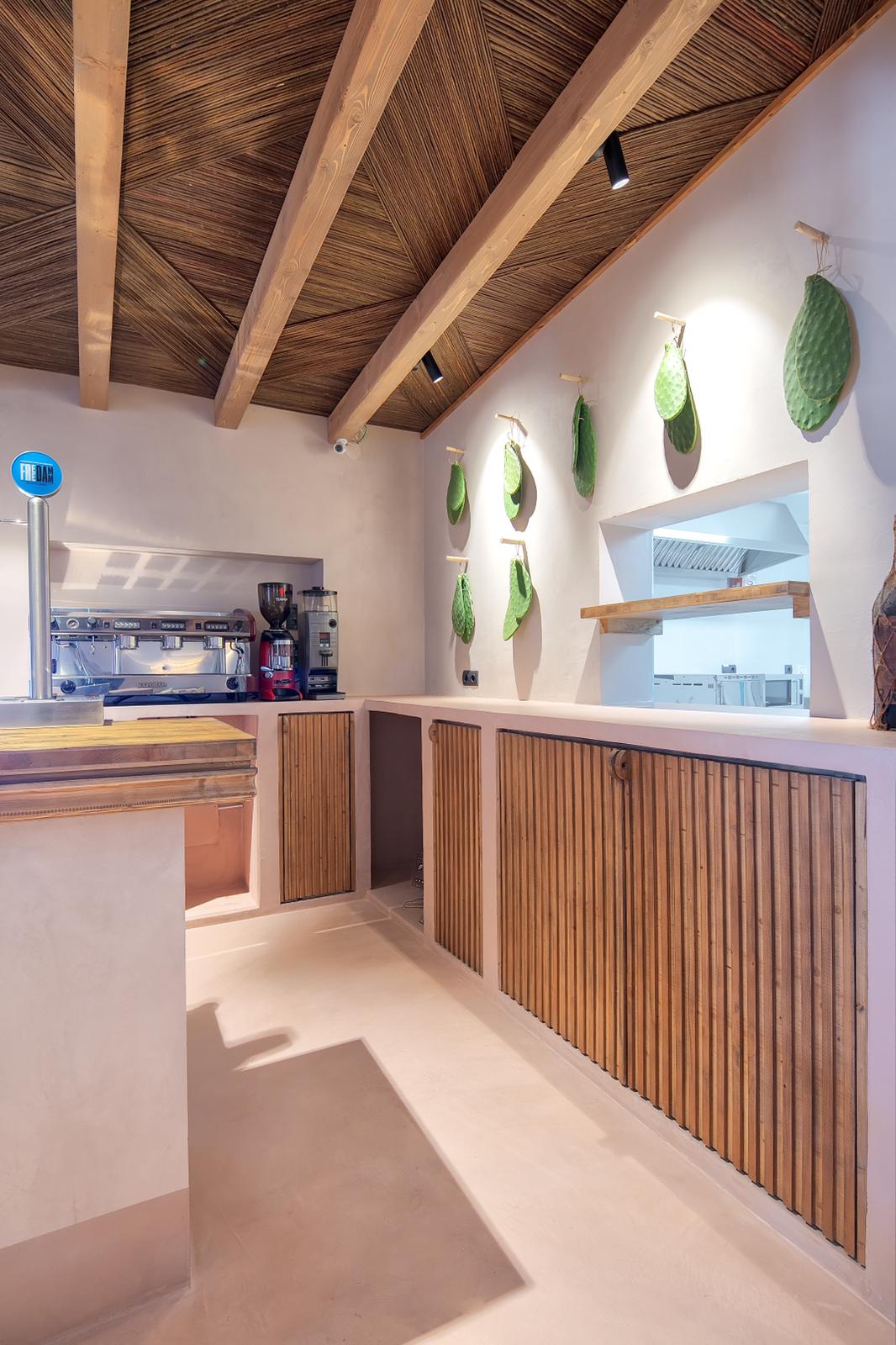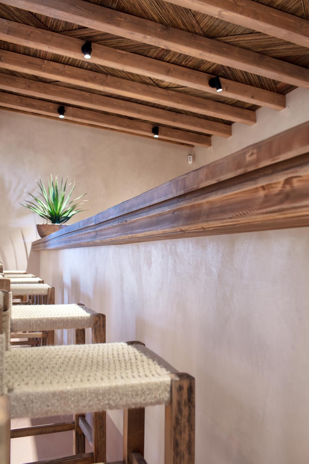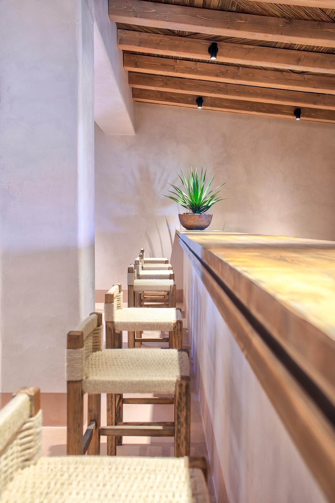 La iluminación suave y las lámparas de pared realzan el ambiente íntimo. El área del bar, con taburetes de madera y una máquina de café moderna, proporciona un contraste entre lo tradicional y lo contemporáneo. La decoración, que incluye elementos verdes en la pared, aporta un toque de frescura y conexión con la naturaleza, armonizando el espacio de manera equilibrada.