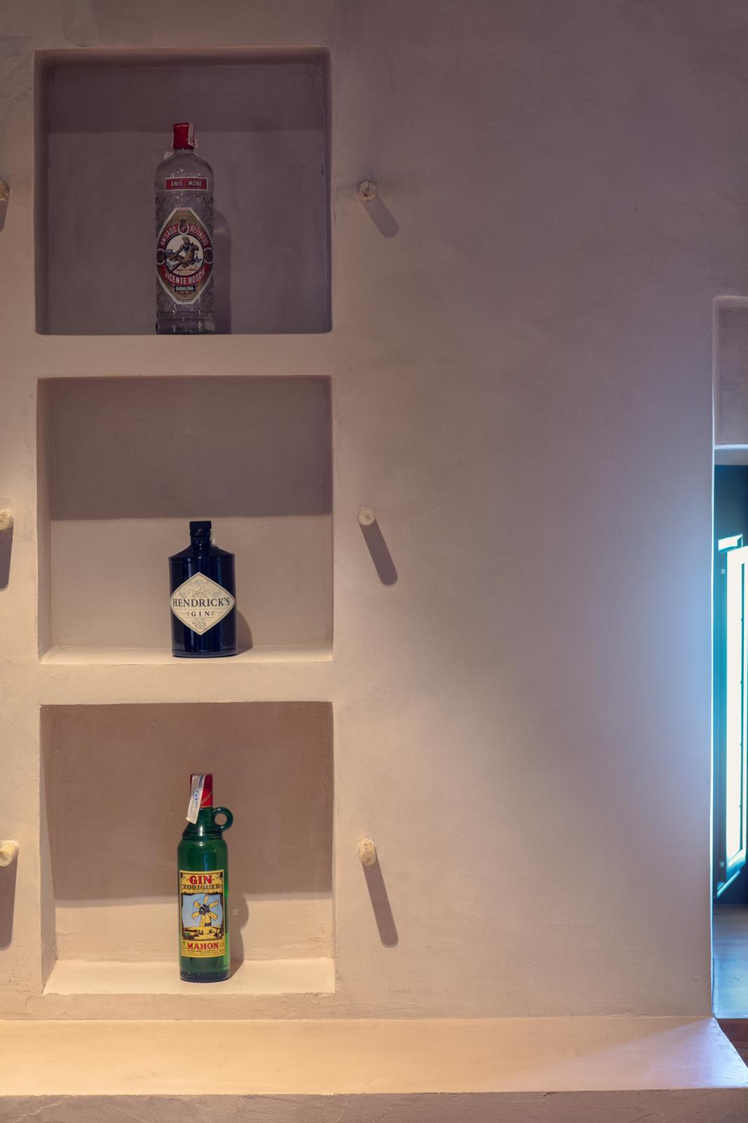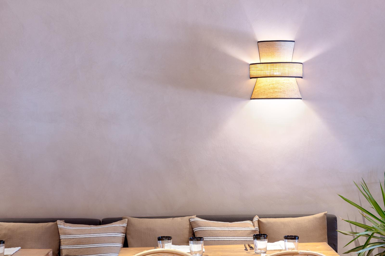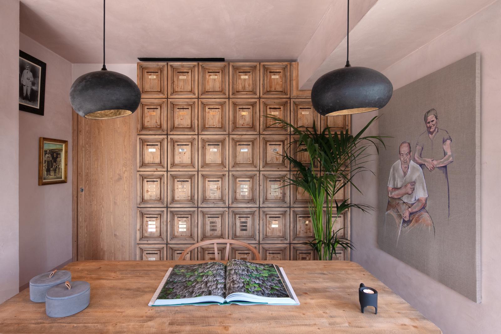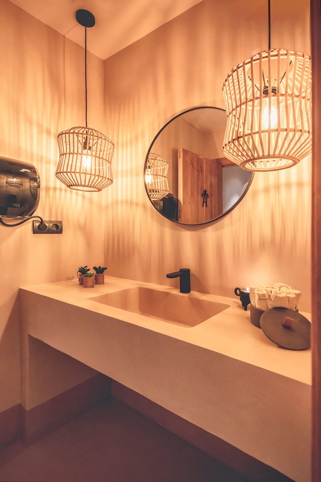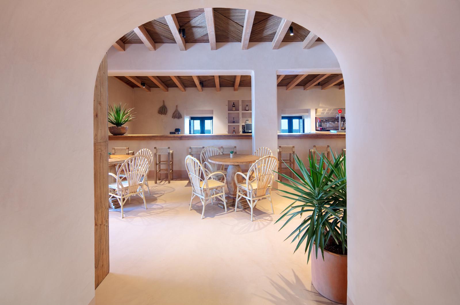 La iluminación suave y las lámparas de pared realzan el ambiente íntimo. El área del bar, con taburetes de madera y una máquina de café moderna, proporciona un contraste entre lo tradicional y lo contemporáneo. La decoración, que incluye elementos verdes en la pared, aporta un toque de frescura y conexión con la naturaleza, armonizando el espacio de manera equilibrada.