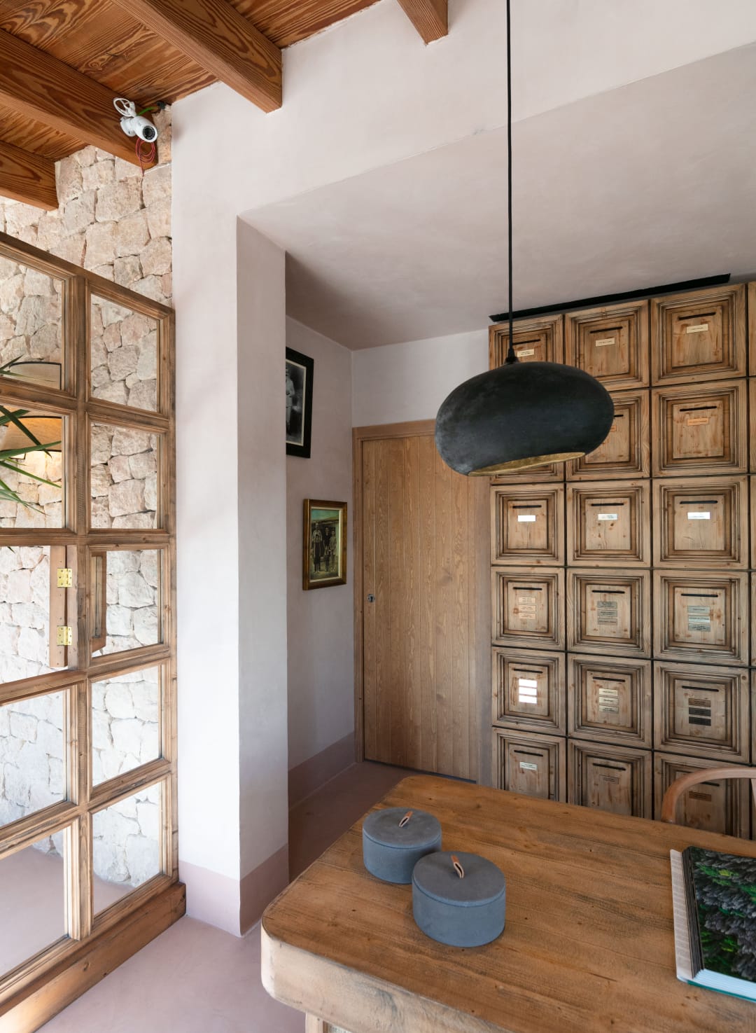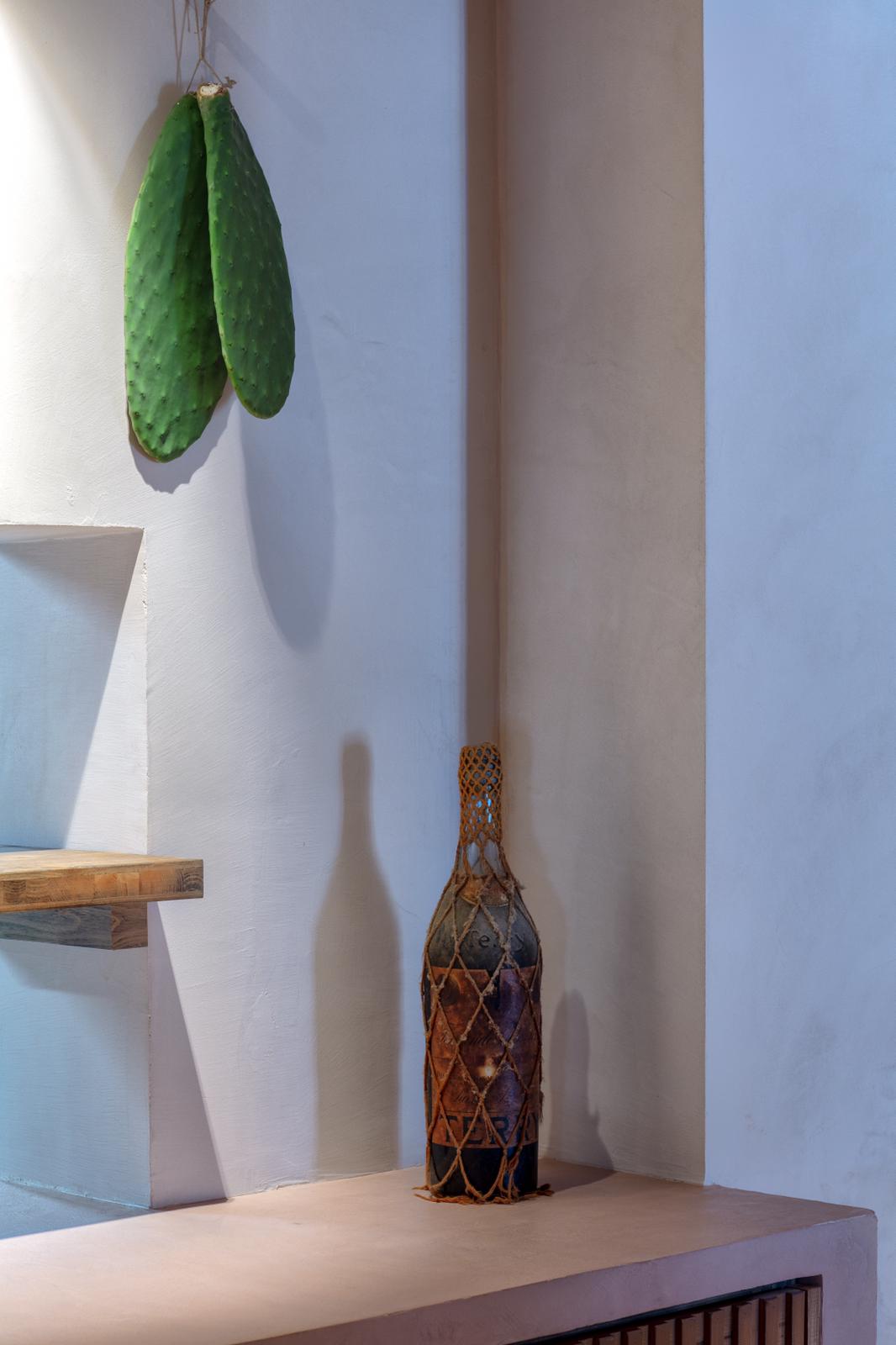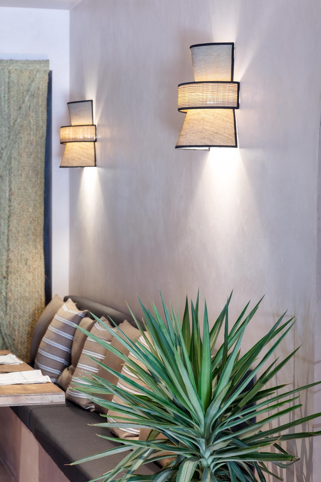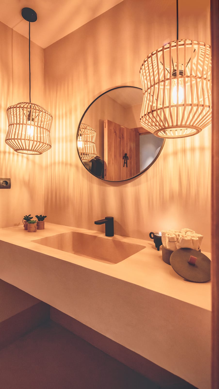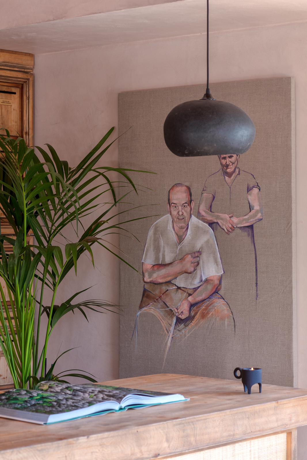 La iluminación suave y las lámparas de pared realzan el ambiente íntimo. El área del bar, con taburetes de madera y una máquina de café moderna, proporciona un contraste entre lo tradicional y lo contemporáneo. La decoración, que incluye elementos verdes en la pared, aporta un toque de frescura y conexión con la naturaleza, armonizando el espacio de manera equilibrada.