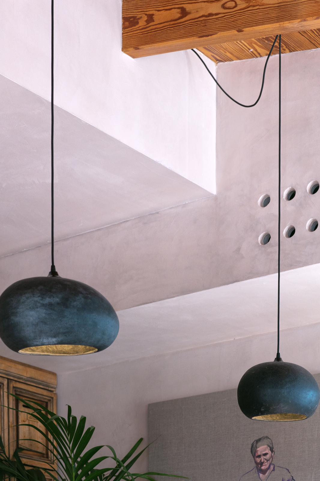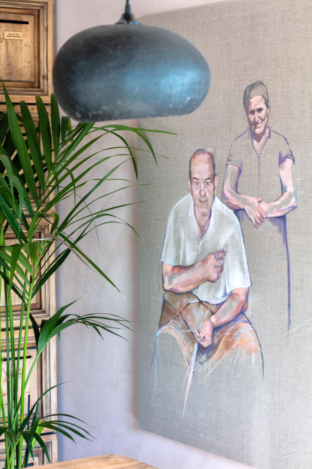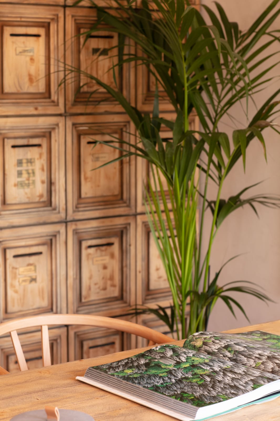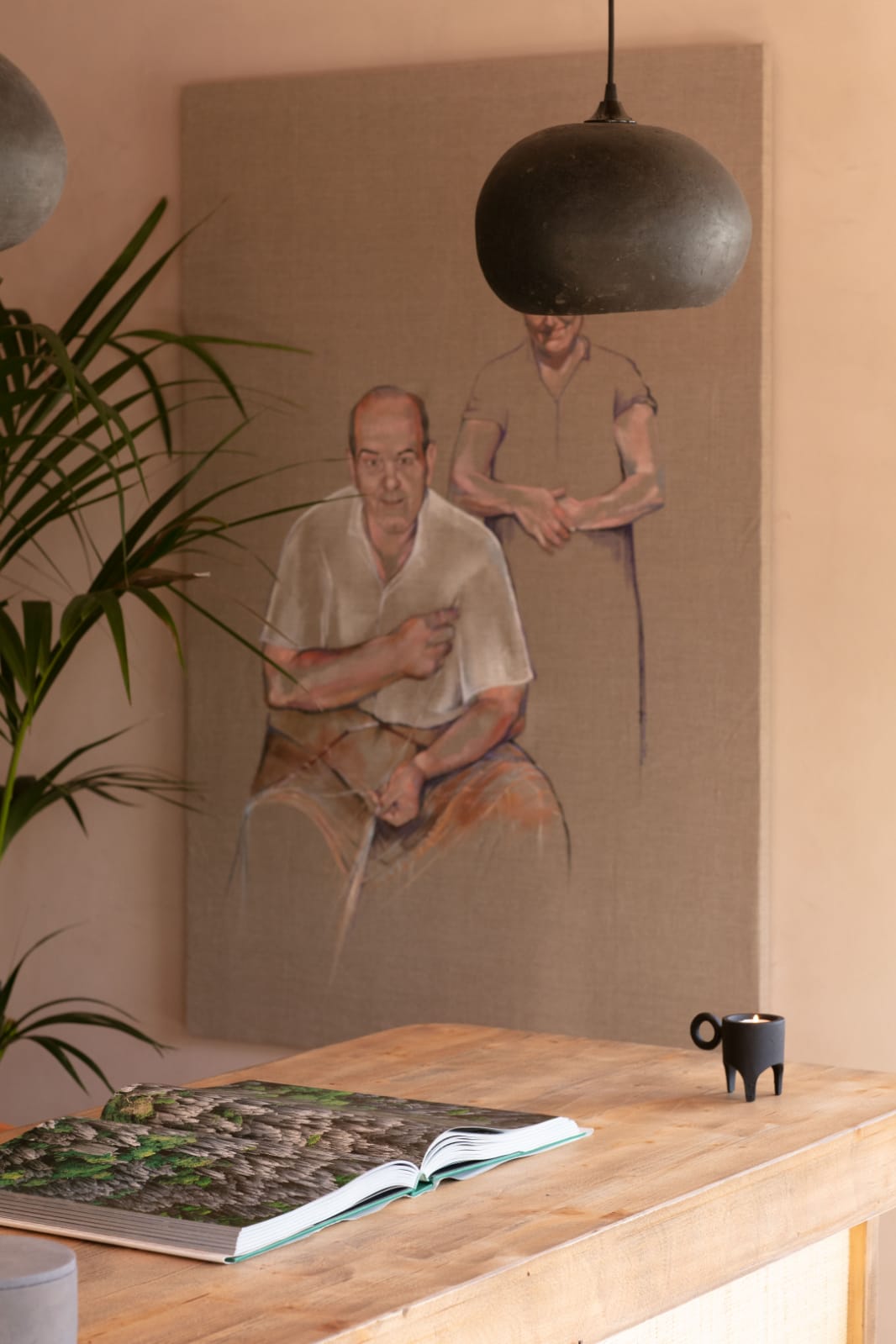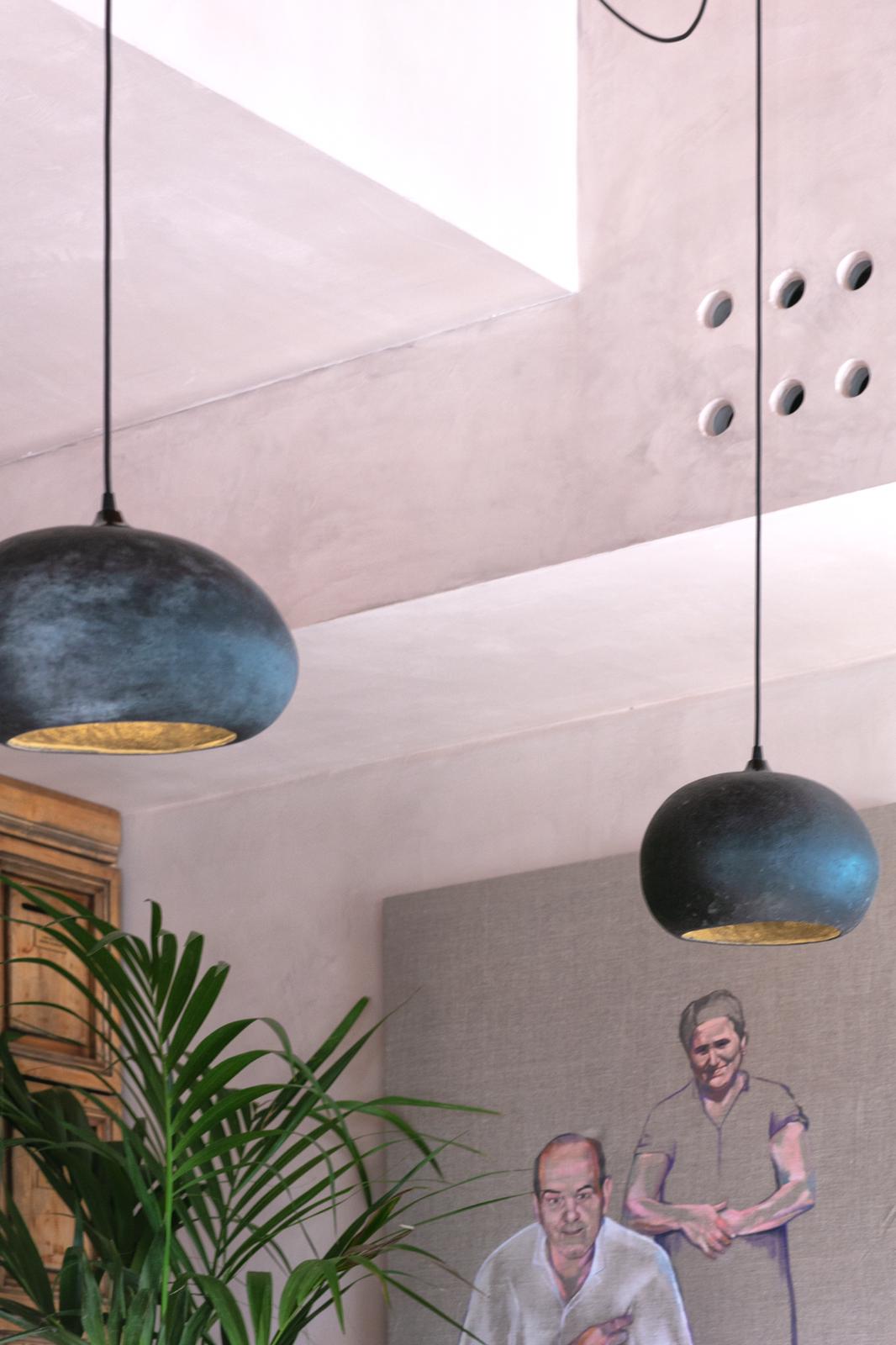 La iluminación suave y las lámparas de pared realzan el ambiente íntimo. El área del bar, con taburetes de madera y una máquina de café moderna, proporciona un contraste entre lo tradicional y lo contemporáneo. La decoración, que incluye elementos verdes en la pared, aporta un toque de frescura y conexión con la naturaleza, armonizando el espacio de manera equilibrada.