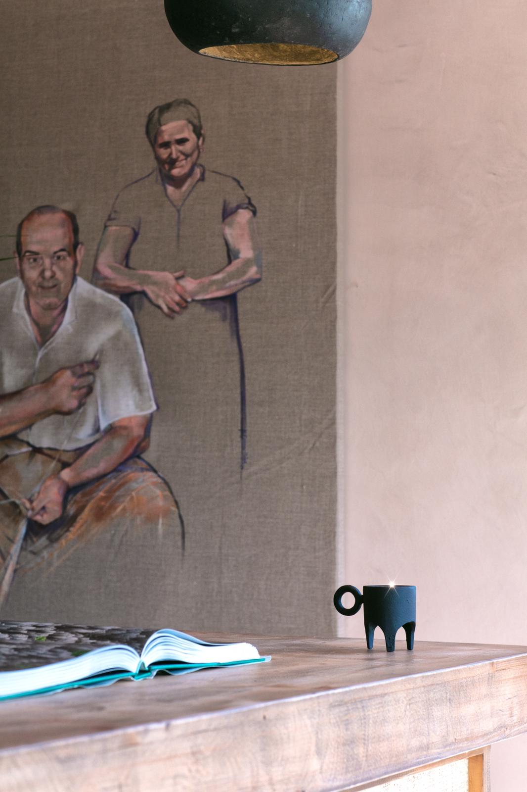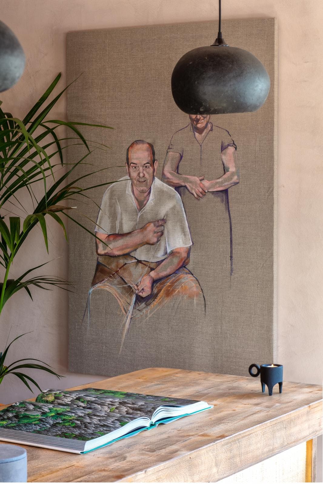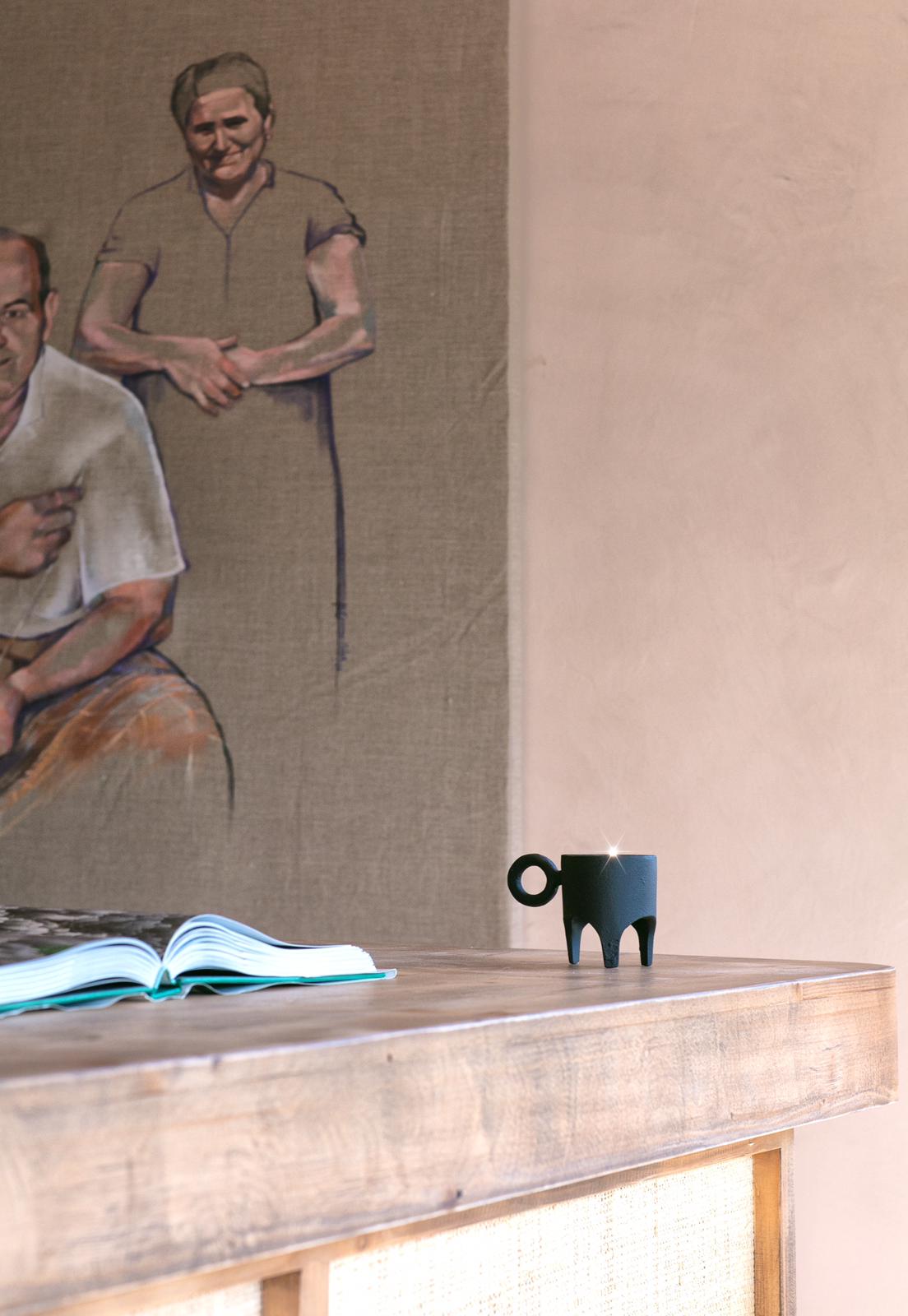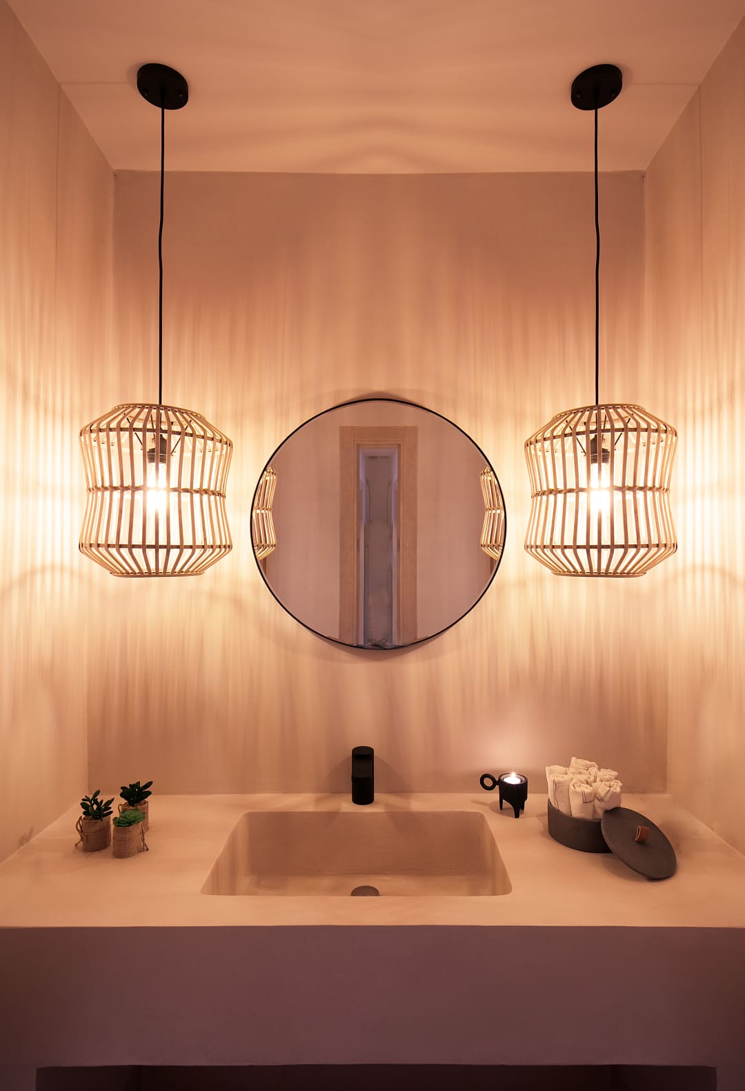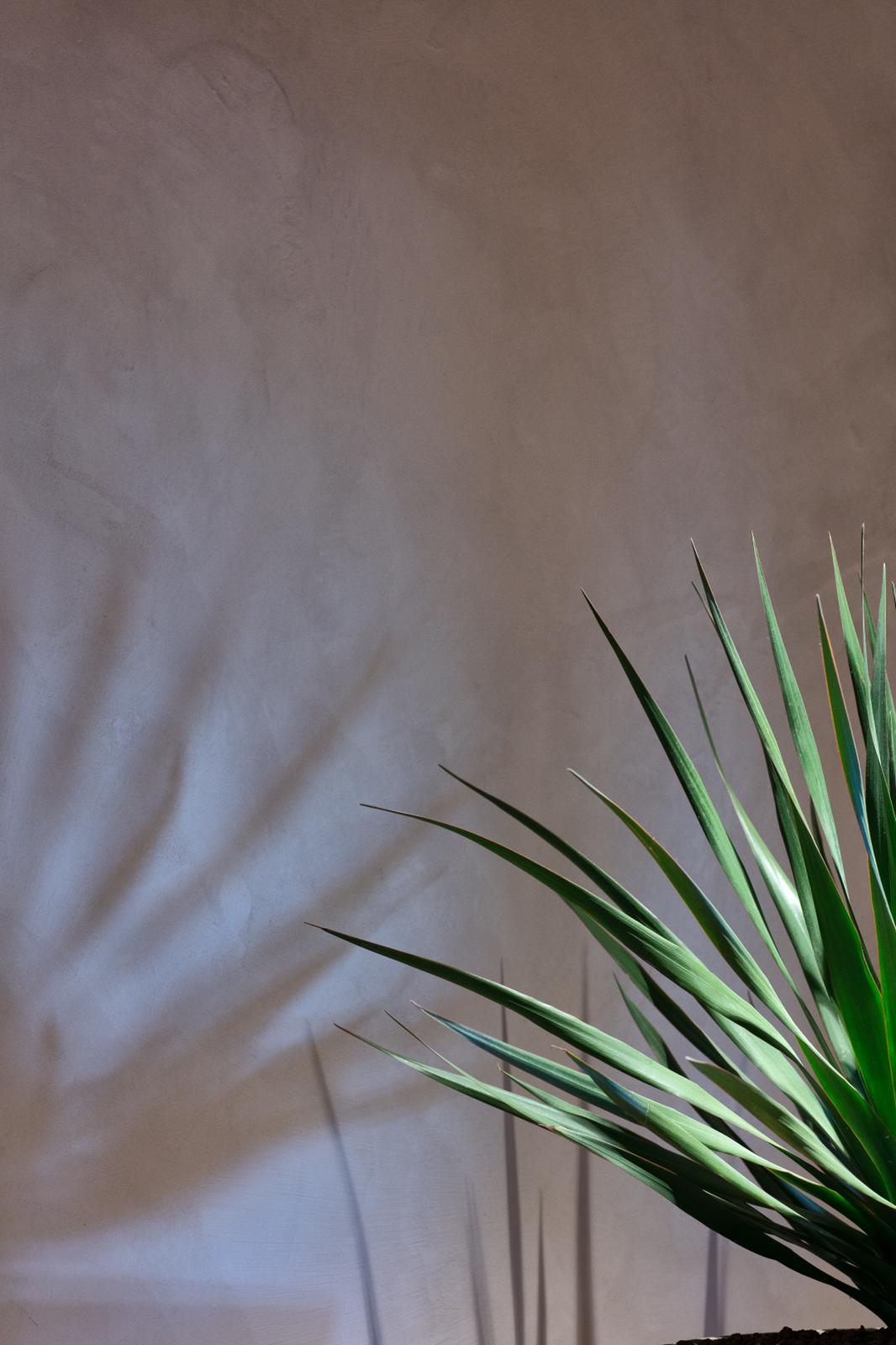 La iluminación suave y las lámparas de pared realzan el ambiente íntimo. El área del bar, con taburetes de madera y una máquina de café moderna, proporciona un contraste entre lo tradicional y lo contemporáneo. La decoración, que incluye elementos verdes en la pared, aporta un toque de frescura y conexión con la naturaleza, armonizando el espacio de manera equilibrada.
