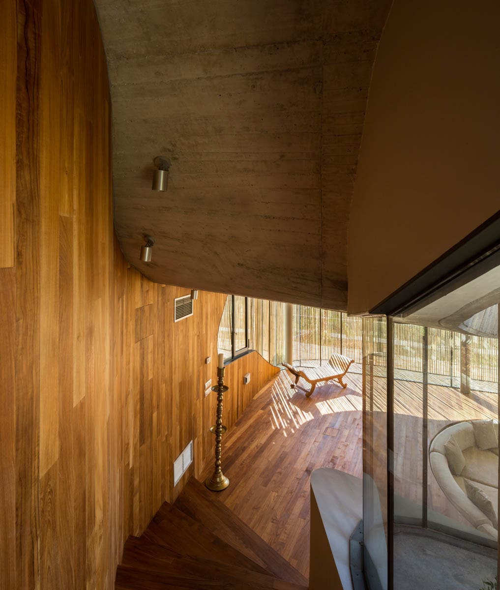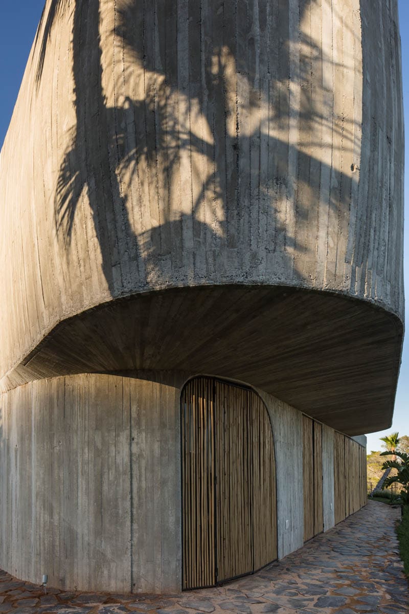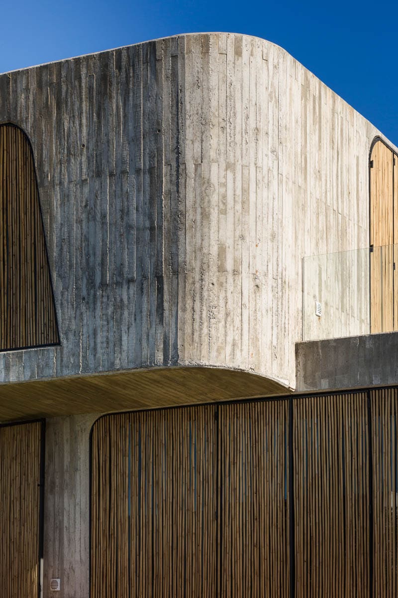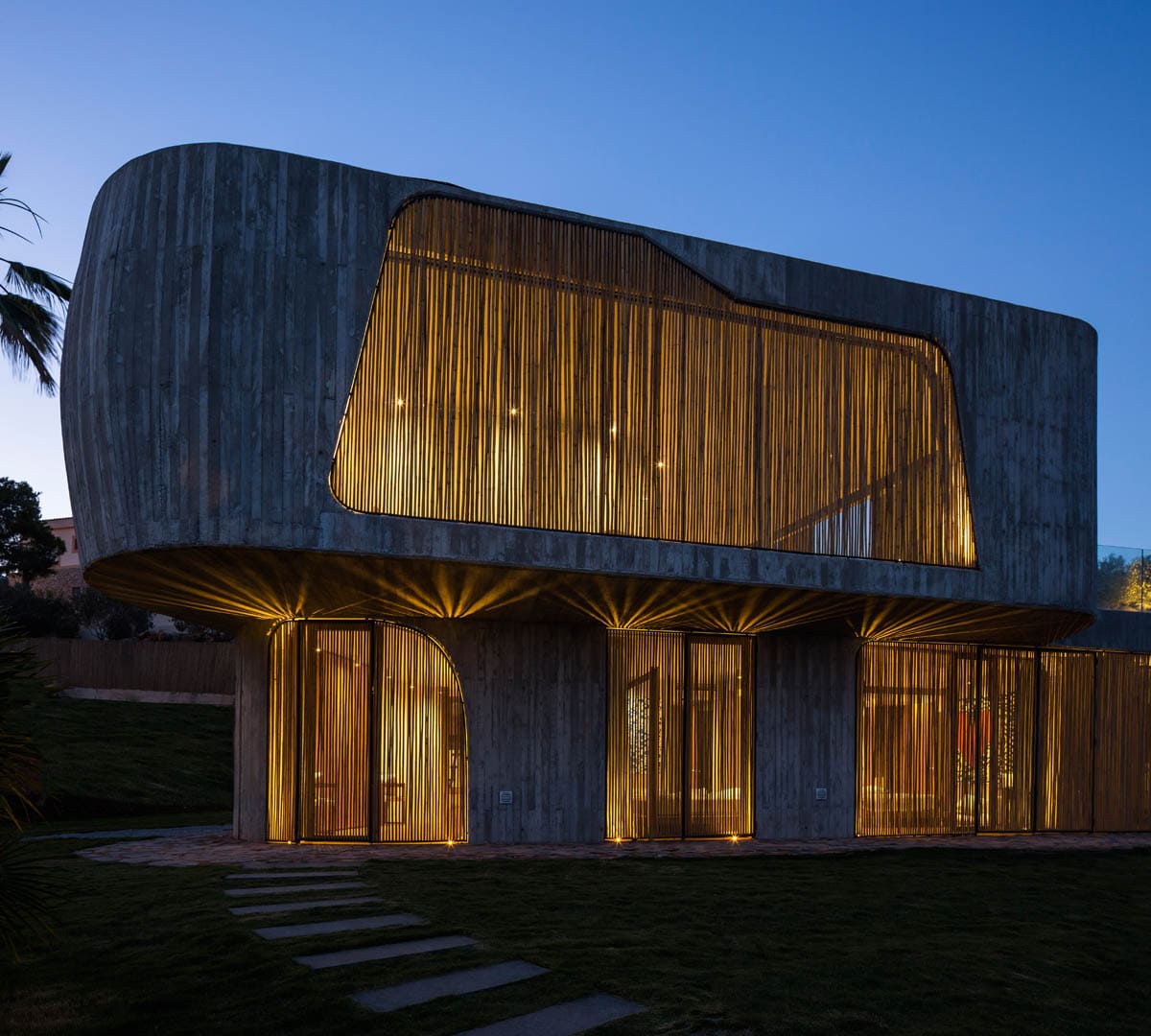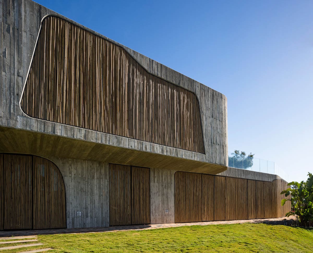 Villa unifamiliar de estilo contemporáneo con influencias orgánicas, ubicada en un entorno natural. La estructura de dos niveles está construida con hormigón expuesto con formas curvas que imitan las líneas del paisaje circundante. Las fachadas están adornadas con paneles de madera verticales que permiten la entrada de luz natural mientras mantienen la privacidad.