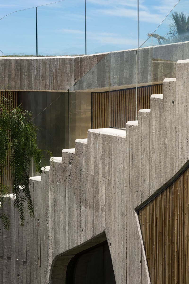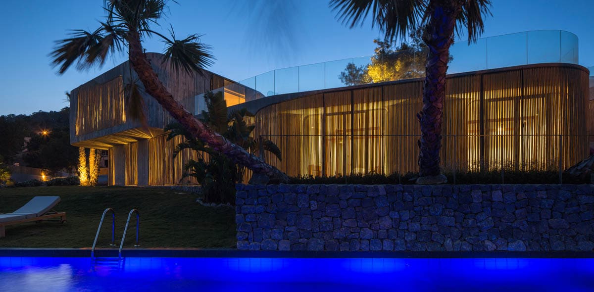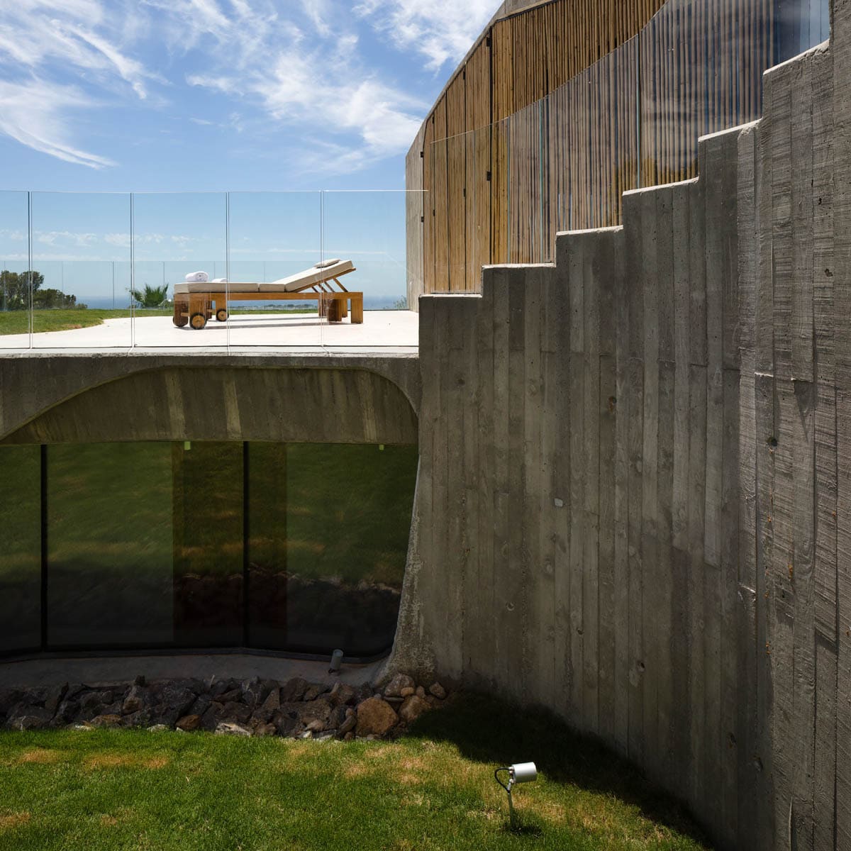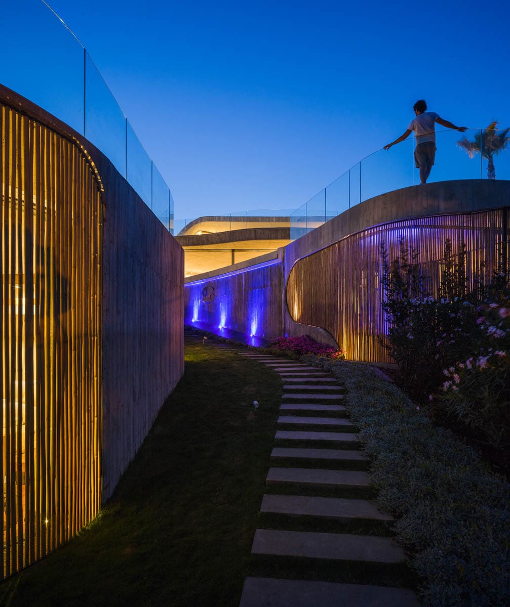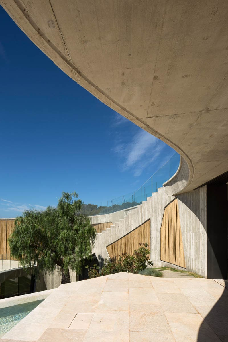 Villa unifamiliar de estilo contemporáneo con influencias orgánicas, ubicada en un entorno natural. La estructura de dos niveles está construida con hormigón expuesto con formas curvas que imitan las líneas del paisaje circundante. Las fachadas están adornadas con paneles de madera verticales que permiten la entrada de luz natural mientras mantienen la privacidad.
