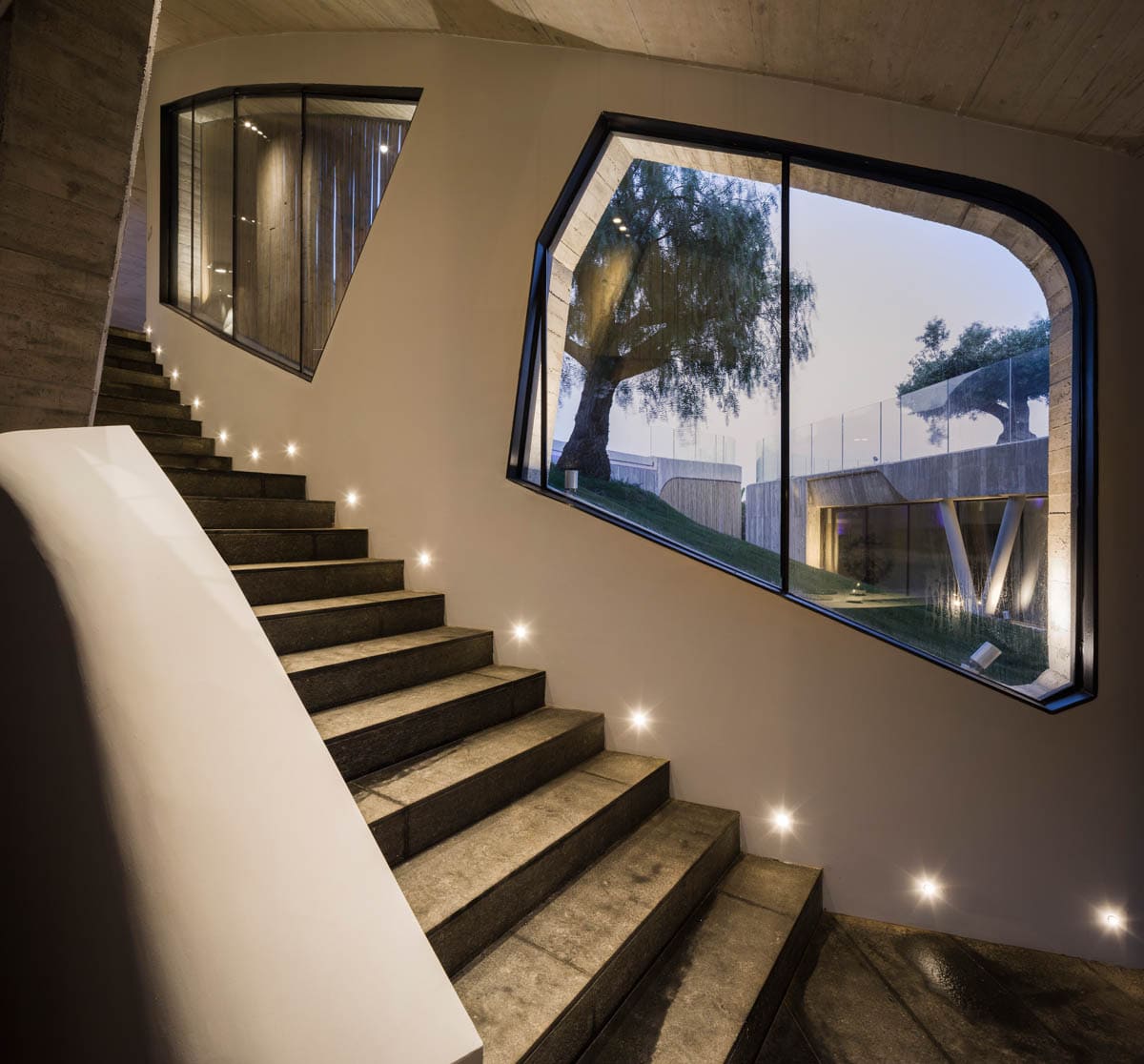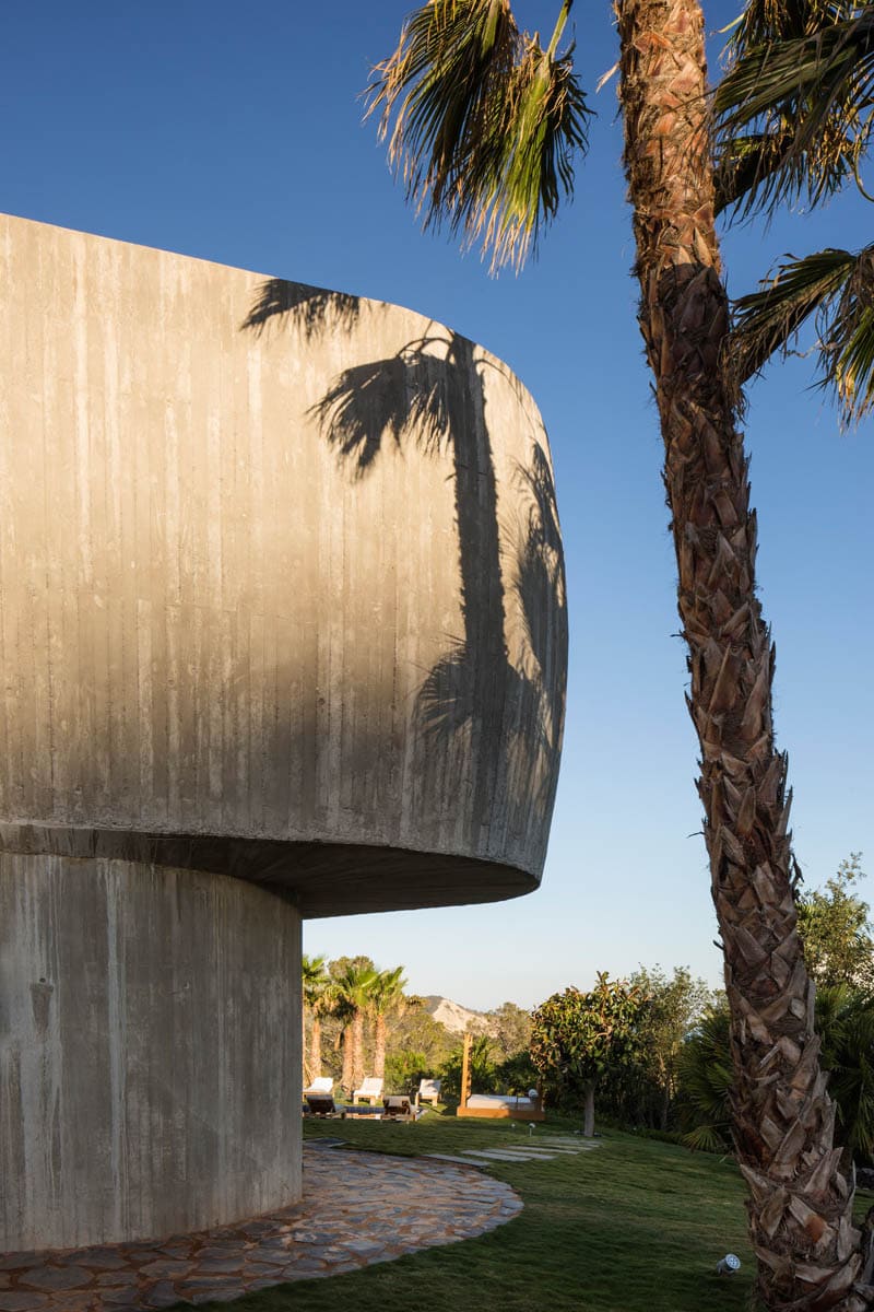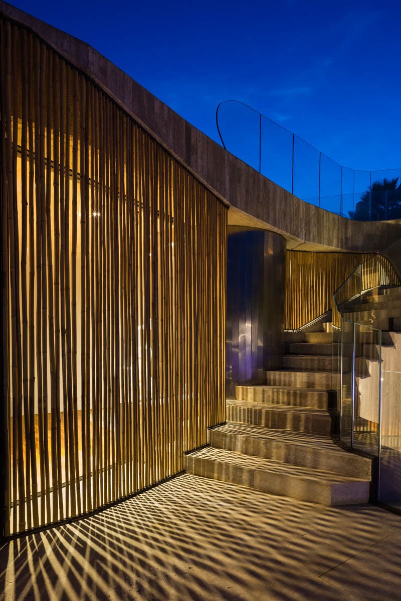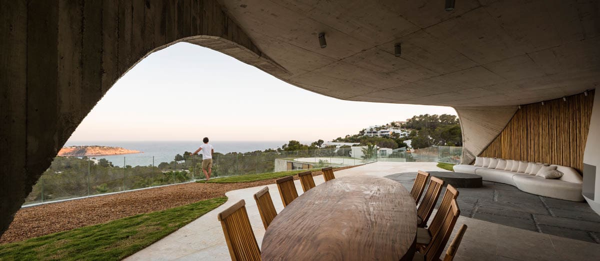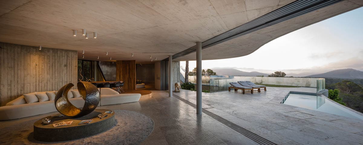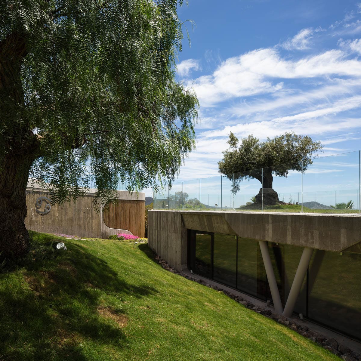Villa unifamiliar de estilo contemporáneo con influencias orgánicas, ubicada en un entorno natural. La estructura de dos niveles está construida con hormigón expuesto con formas curvas que imitan las líneas del paisaje circundante. Las fachadas están adornadas con paneles de madera verticales que permiten la entrada de luz natural mientras mantienen la privacidad.
