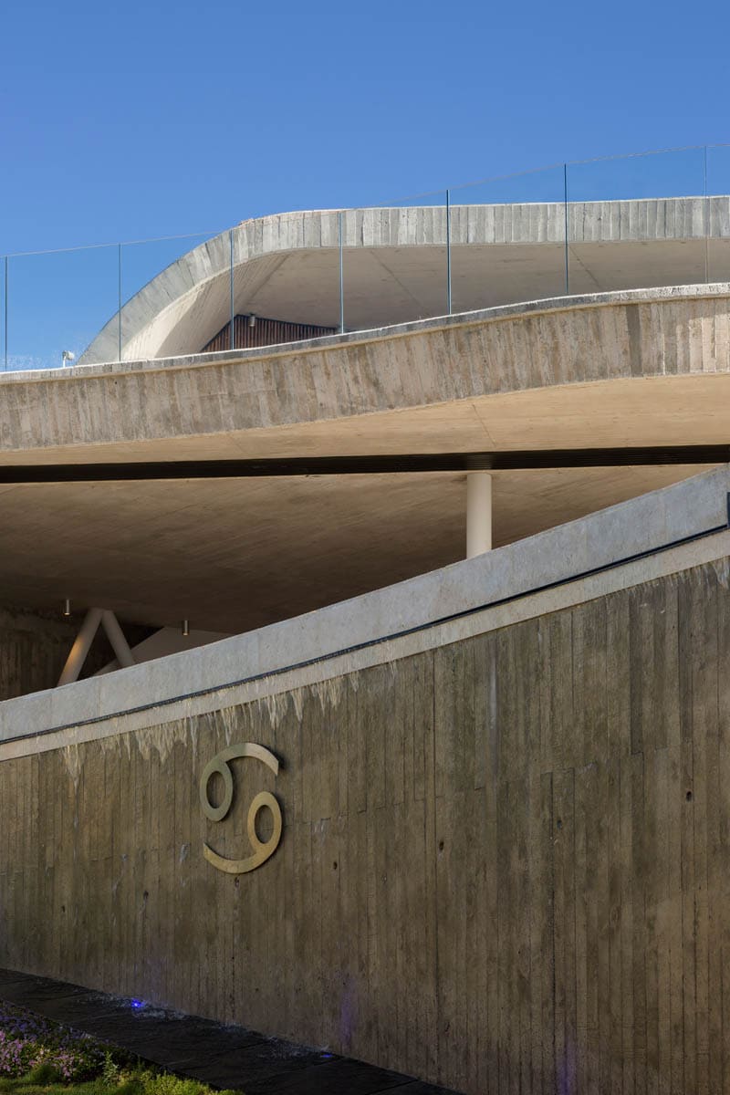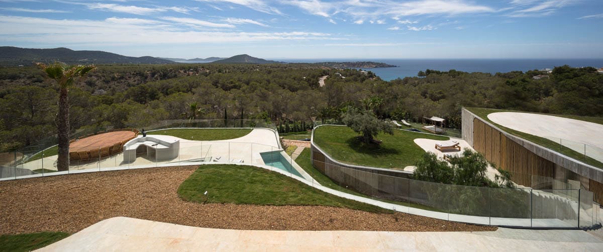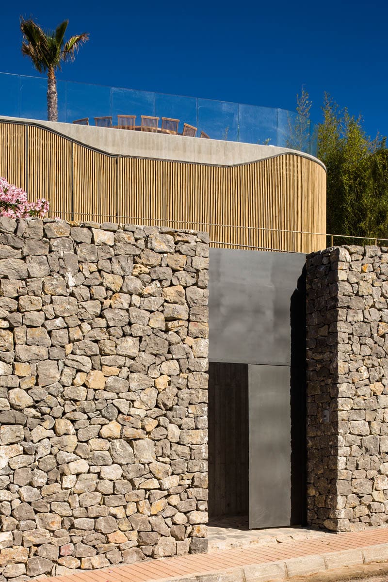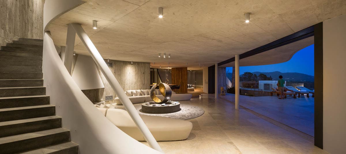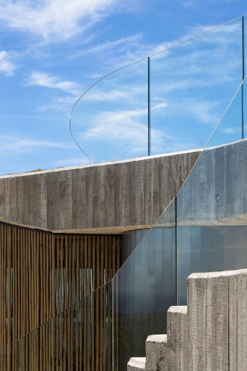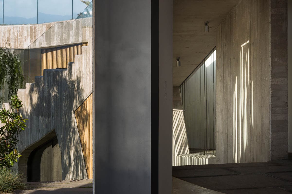 Villa unifamiliar de estilo contemporáneo con influencias orgánicas, ubicada en un entorno natural. La estructura de dos niveles está construida con hormigón expuesto con formas curvas que imitan las líneas del paisaje circundante. Las fachadas están adornadas con paneles de madera verticales que permiten la entrada de luz natural mientras mantienen la privacidad.