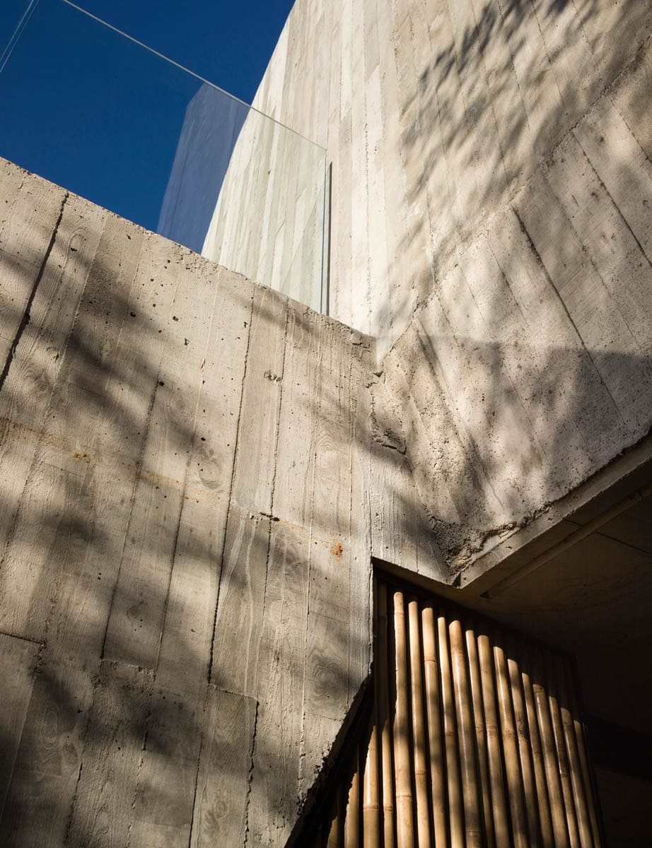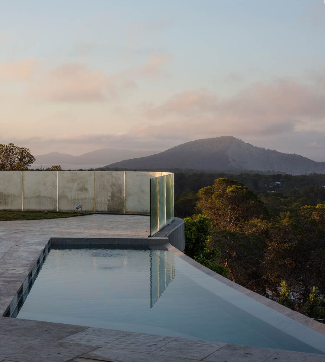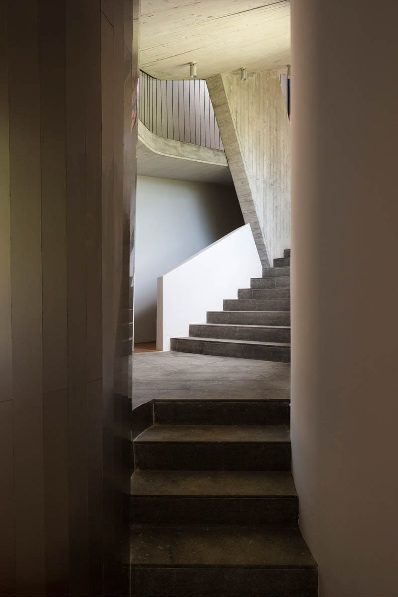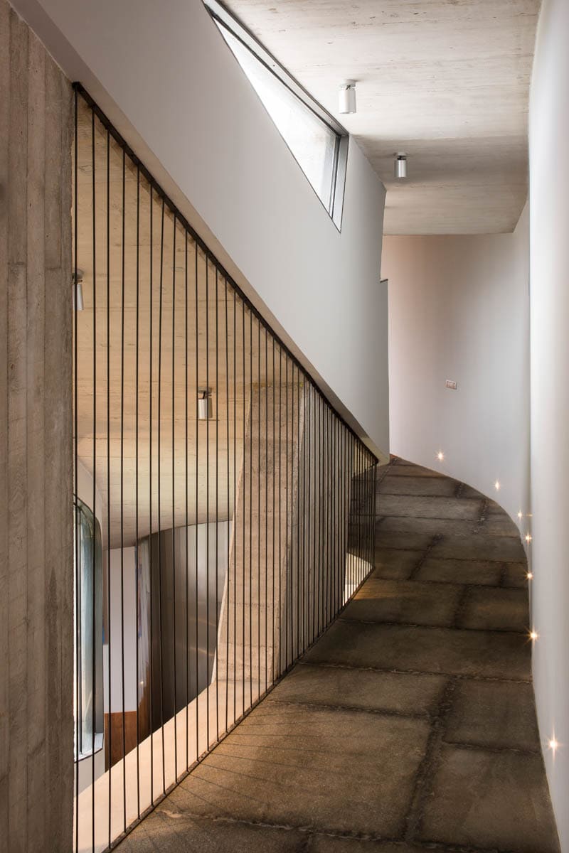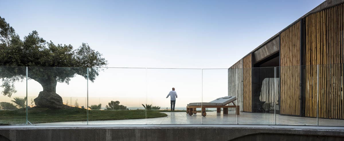 Villa unifamiliar de estilo contemporáneo con influencias orgánicas, ubicada en un entorno natural. La estructura de dos niveles está construida con hormigón expuesto con formas curvas que imitan las líneas del paisaje circundante. Las fachadas están adornadas con paneles de madera verticales que permiten la entrada de luz natural mientras mantienen la privacidad.