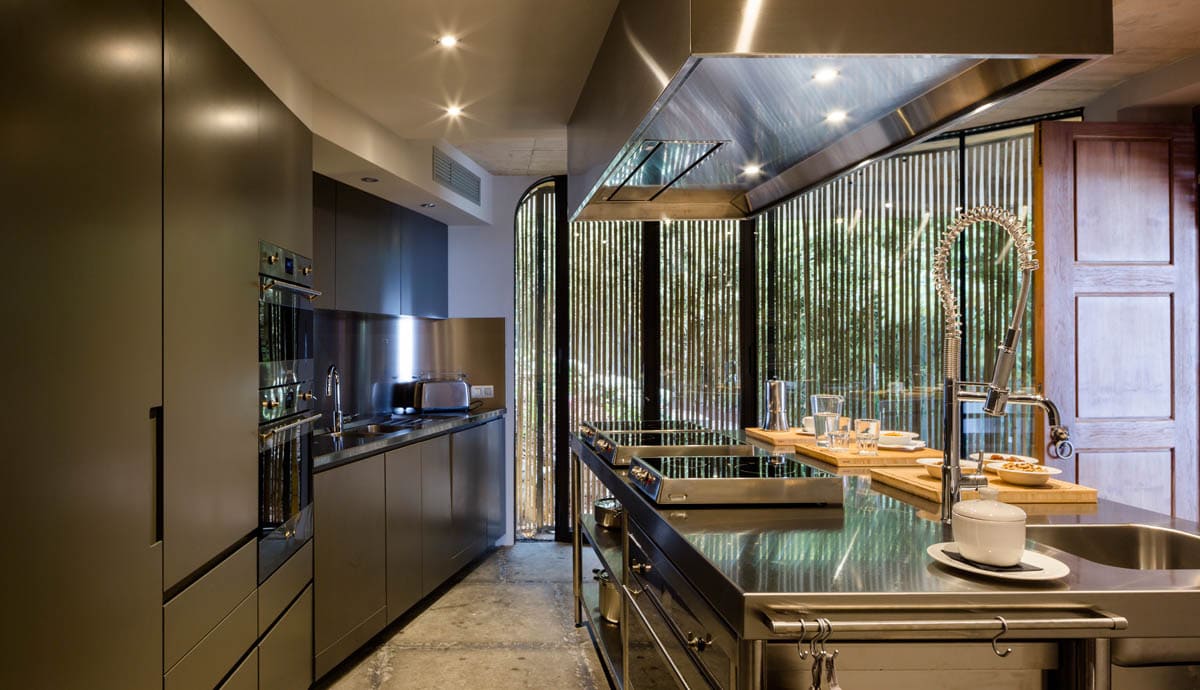 Grandes ventanales de piso a techo ofrecen vistas panorámicas y conectan el interior con el exterior. La iluminación cálida y sutil destaca los detalles arquitectónicos al anochecer, creando un ambiente acogedor y armonioso. La vegetación tropical y el césped bien cuidado completan el diseño, integrando la villa perfectamente en su entorno natural.