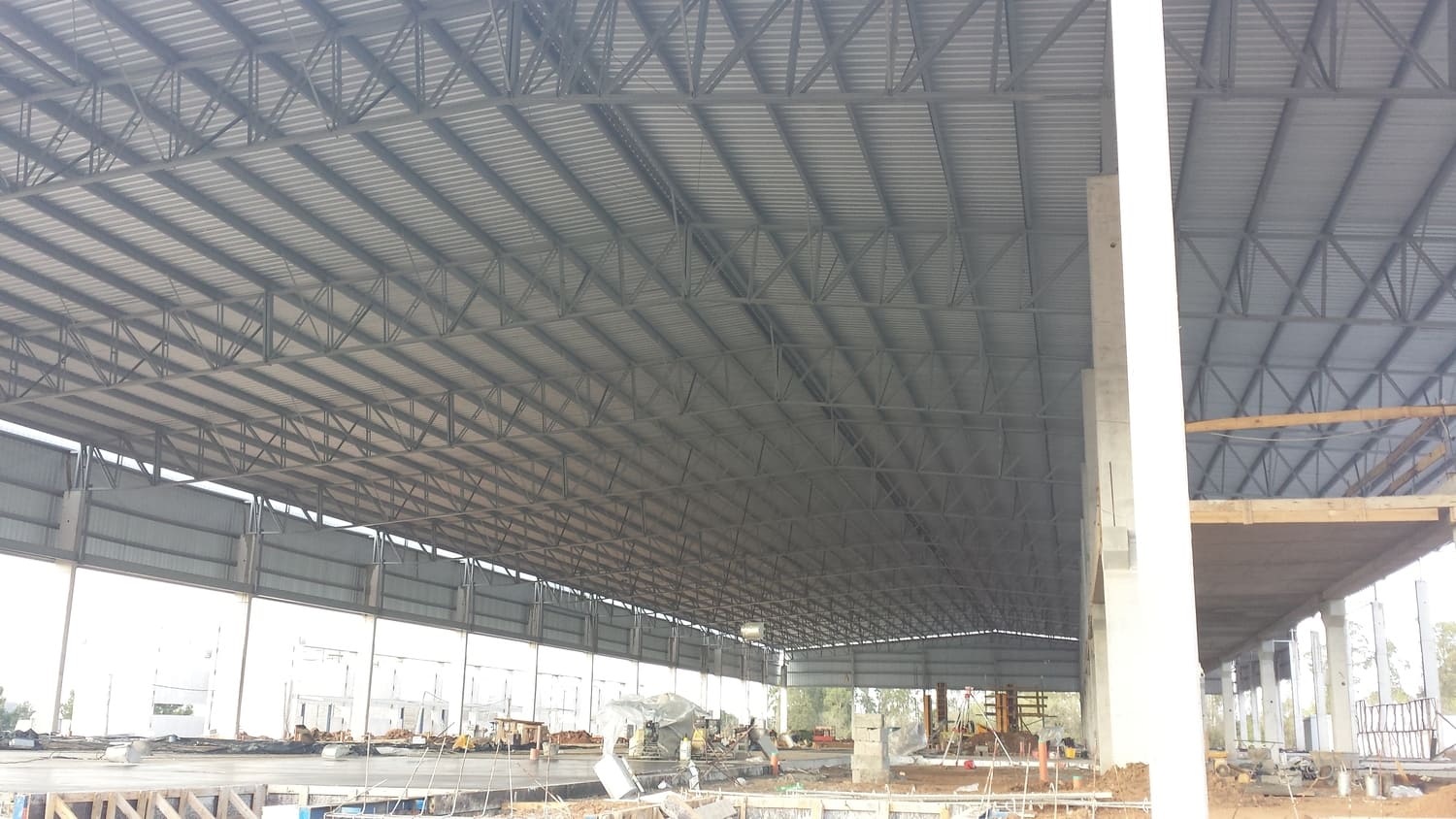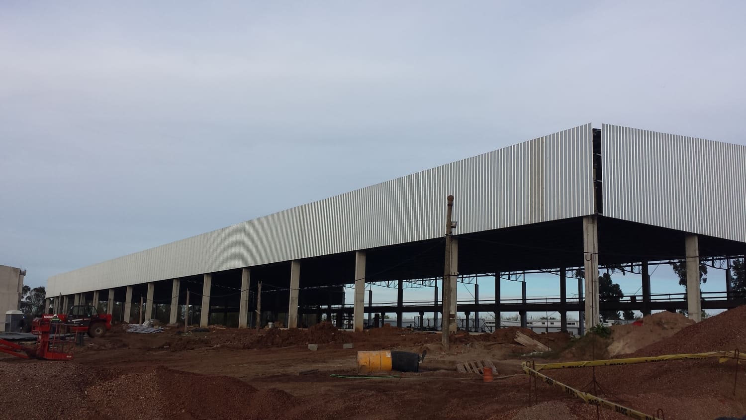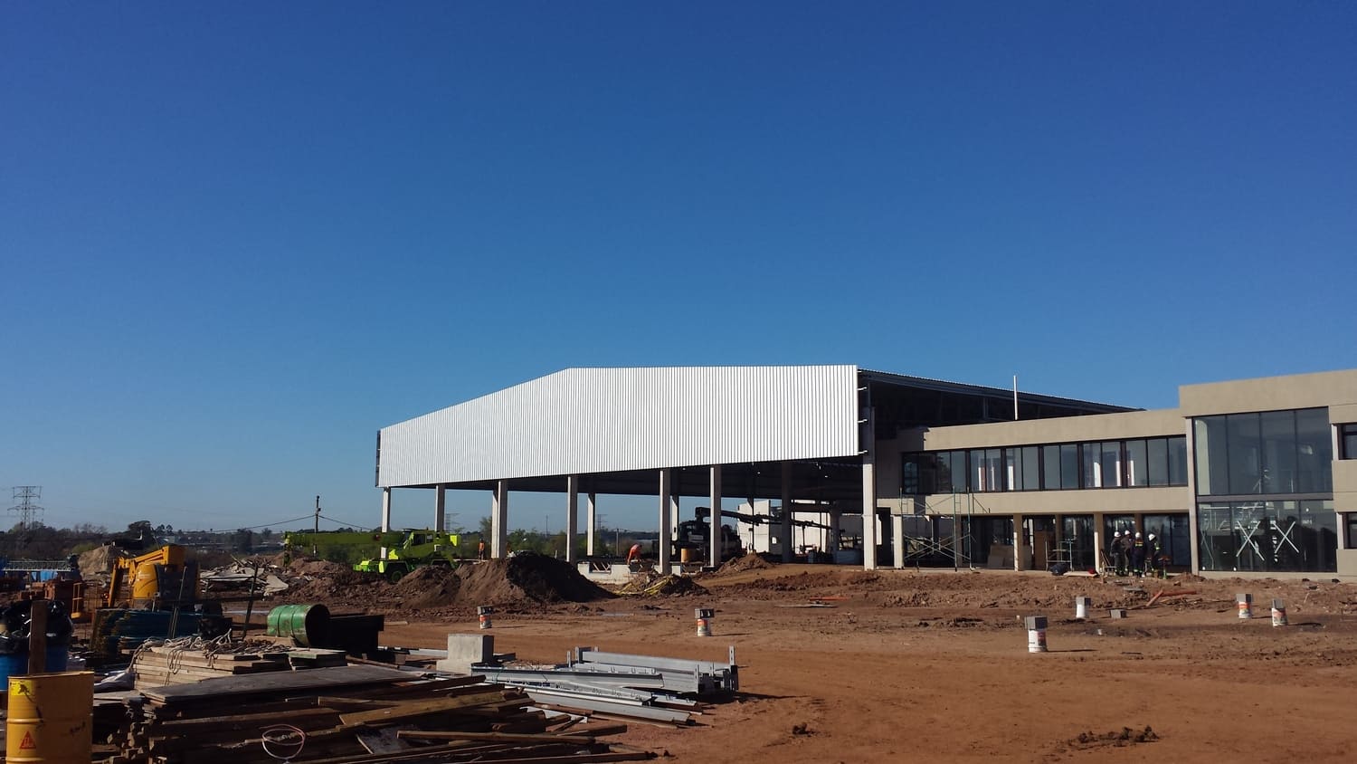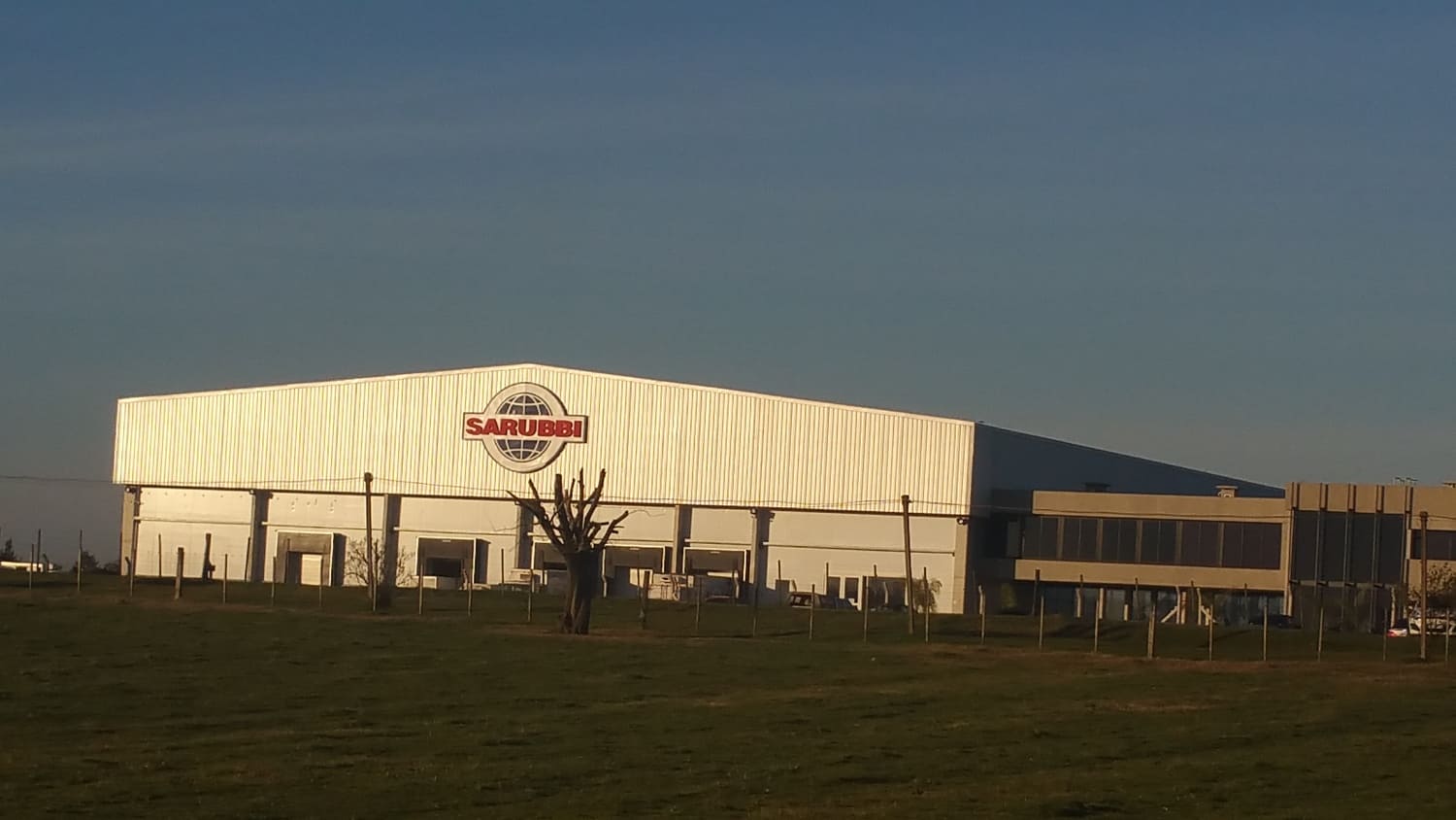 Planta industrial de la empresa Sarubbi, con un diseño funcional y contemporáneo. El edificio principal es una gran estructura rectangular con un revestimiento metálico en color claro, probablemente aluminio o acero, diseñado para resistir las condiciones climáticas y proporcionar durabilidad. El logotipo de Sarubbi, destacado en la fachada, indica claramente la identidad de la empresa y su presencia en la industria. A la derecha del edificio principal, se encuentra una estructura adyacente con grandes ventanales, lo que sugiere áreas administrativas o de oficinas, proporcionando un contraste visual y funcional con la zona de producción.