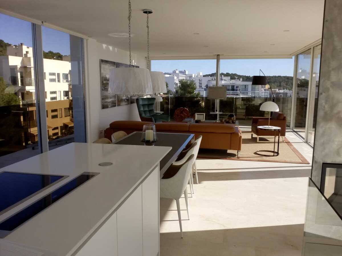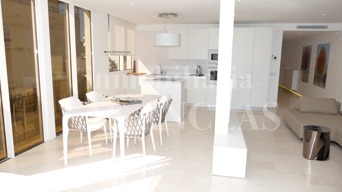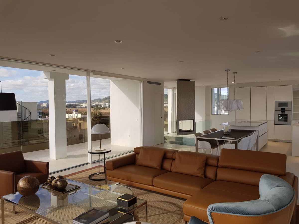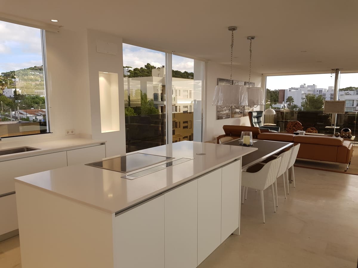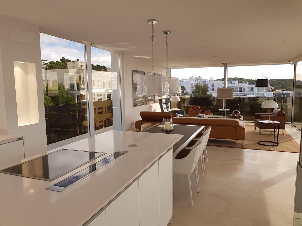 Apartamento con un diseño abierto y luminoso. La sala de estar y la cocina comparten un espacio diáfano, dominado por grandes ventanales de vidrio que permiten la entrada abundante de luz natural y ofrecen vistas panorámicas del entorno exterior. La cocina, con una isla central de diseño minimalista y superficies blancas pulidas, está equipada con electrodomésticos integrados y elegantes lámparas colgantes. La sala de estar cuenta con muebles contemporáneos en tonos marrones y neutros, creando un ambiente acogedor y elegante. Los suelos claros y las paredes blancas amplifican la sensación de amplitud y luminosidad, mientras que elementos decorativos sutiles y plantas aportan un toque de calidez y vida al espacio.