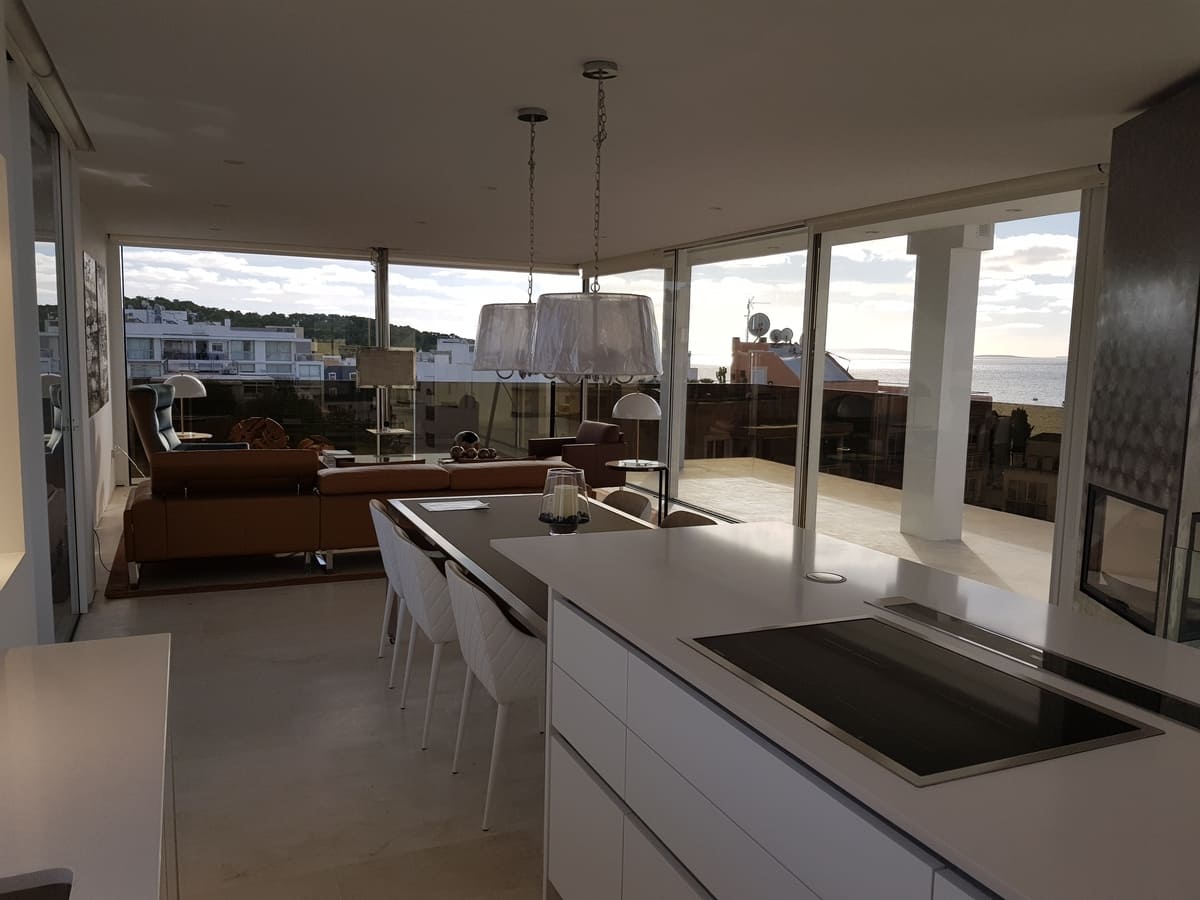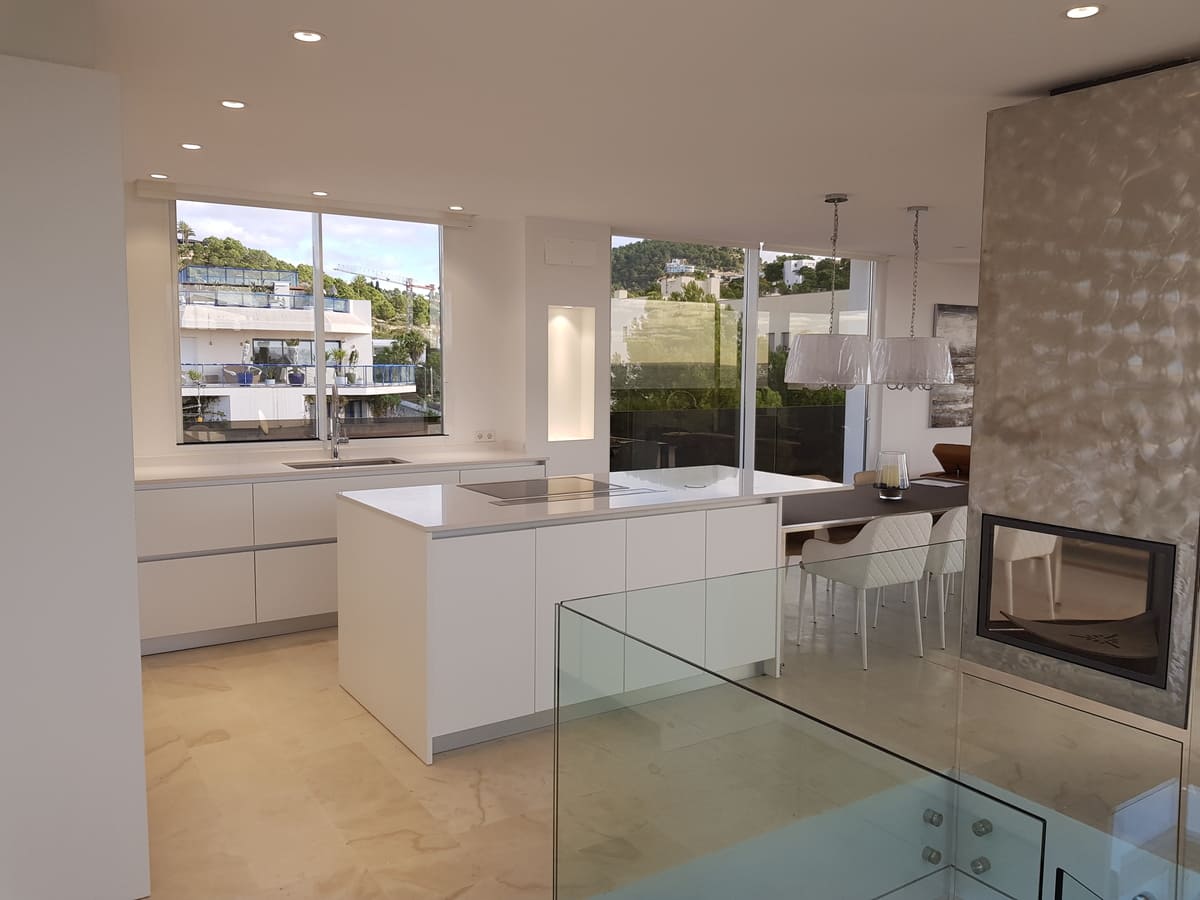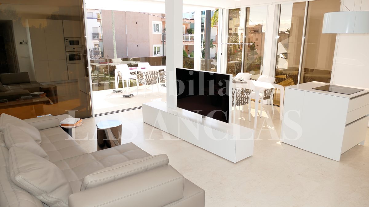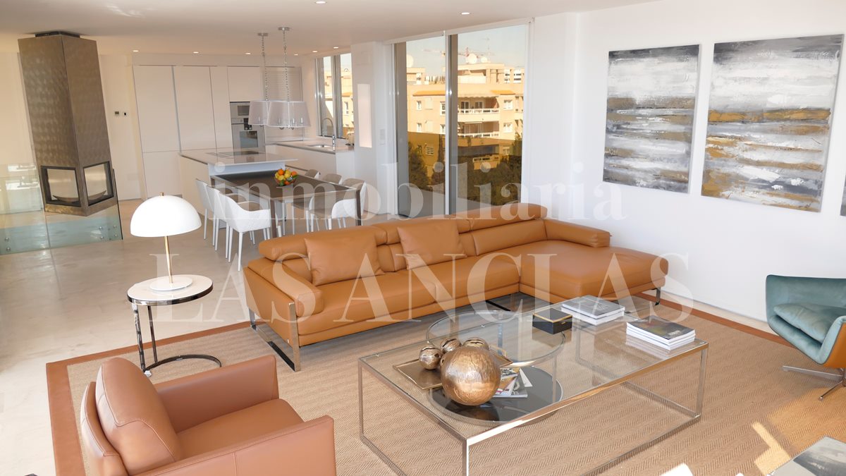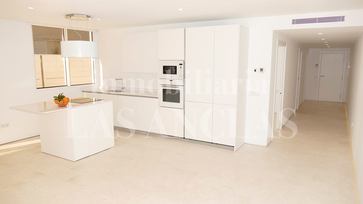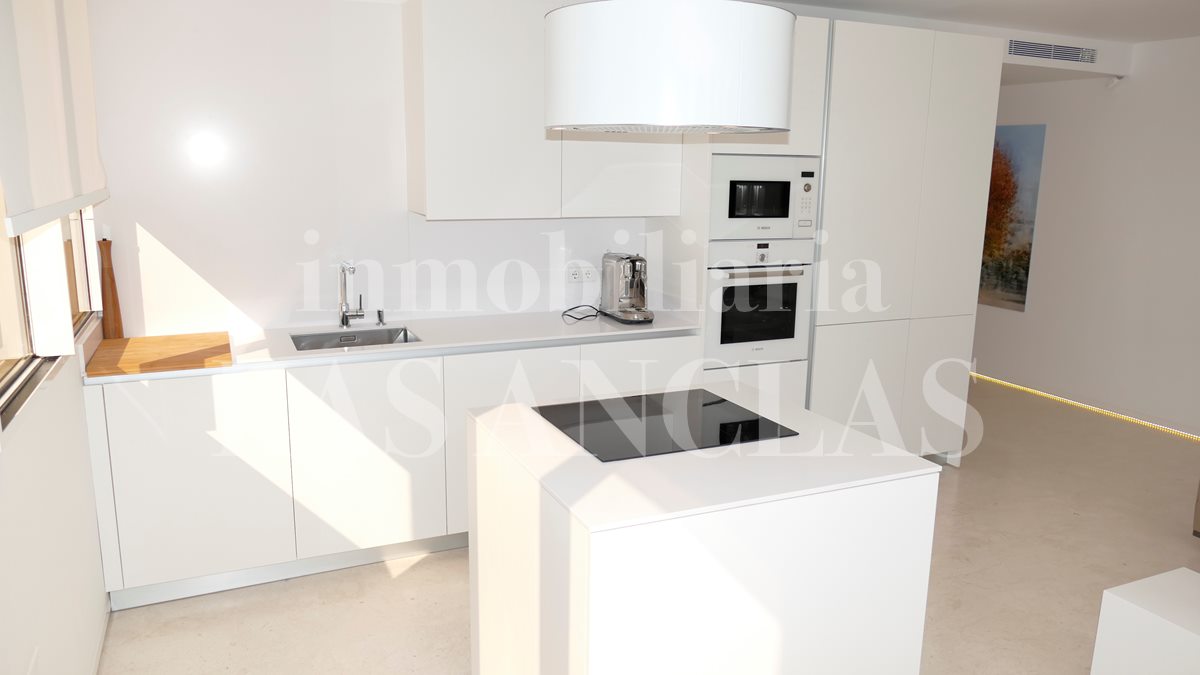Apartamento con un diseño abierto y luminoso. La sala de estar y la cocina comparten un espacio diáfano, dominado por grandes ventanales de vidrio que permiten la entrada abundante de luz natural y ofrecen vistas panorámicas del entorno exterior. La cocina, con una isla central de diseño minimalista y superficies blancas pulidas, está equipada con electrodomésticos integrados y elegantes lámparas colgantes. La sala de estar cuenta con muebles contemporáneos en tonos marrones y neutros, creando un ambiente acogedor y elegante. Los suelos claros y las paredes blancas amplifican la sensación de amplitud y luminosidad, mientras que elementos decorativos sutiles y plantas aportan un toque de calidez y vida al espacio.
