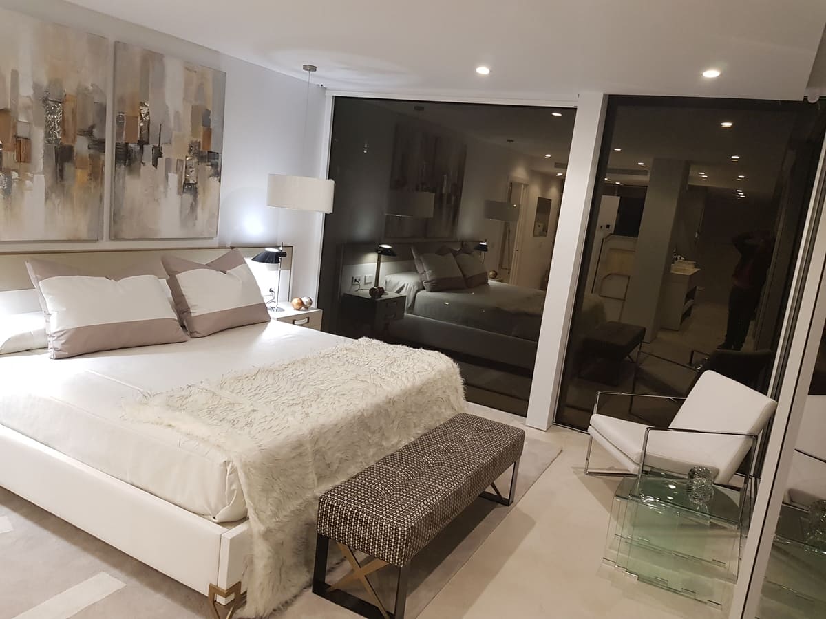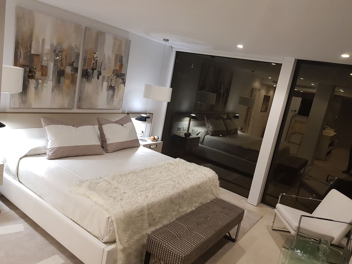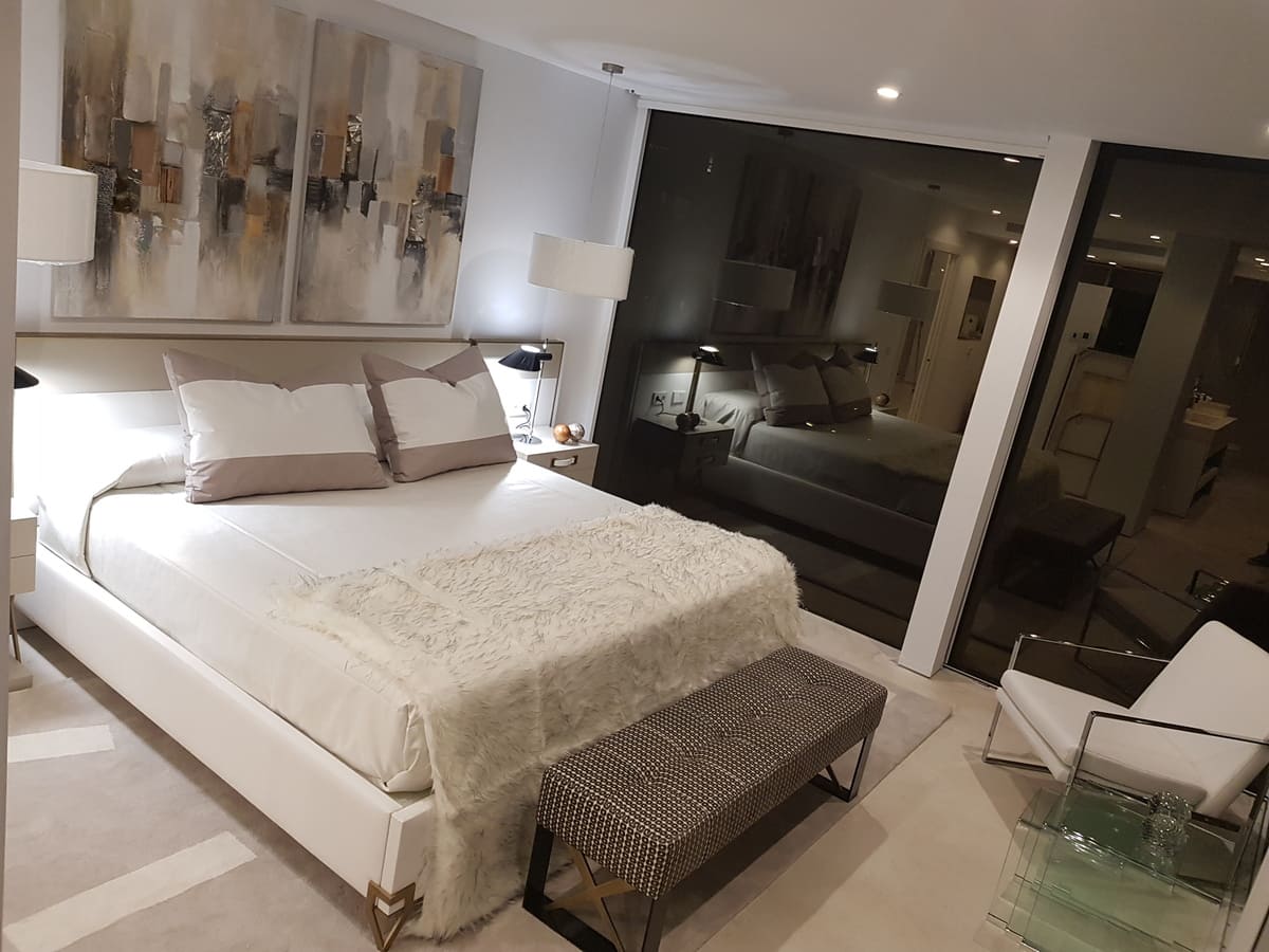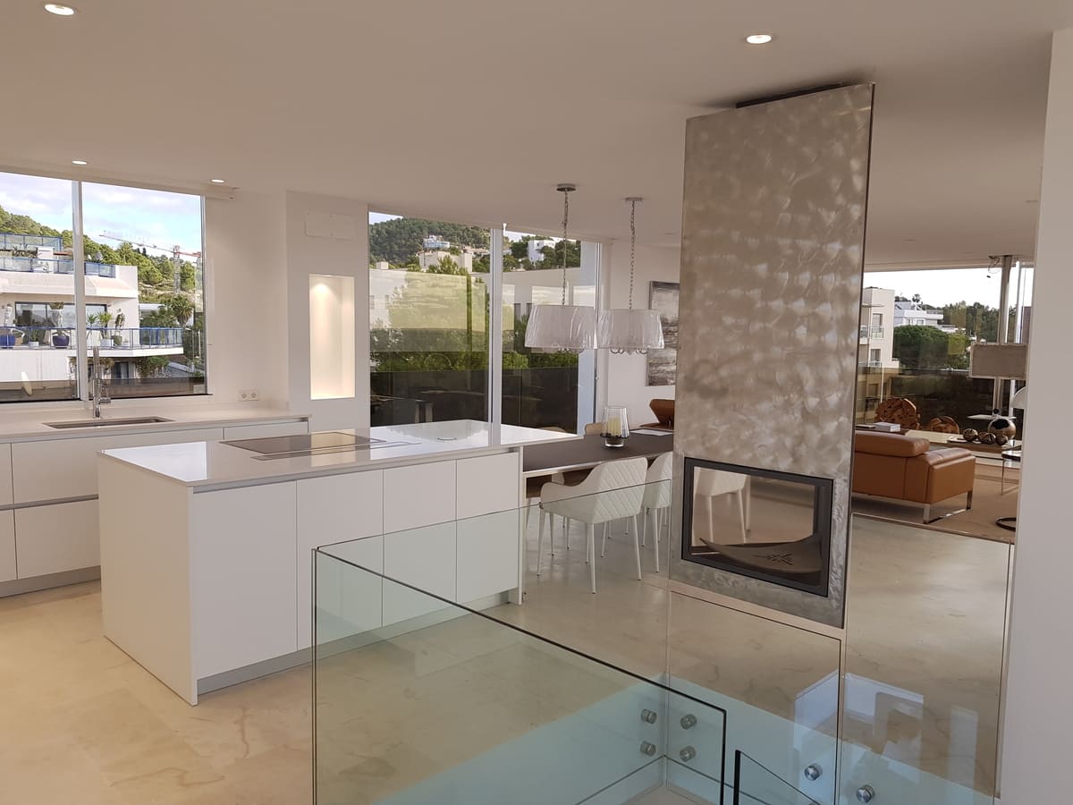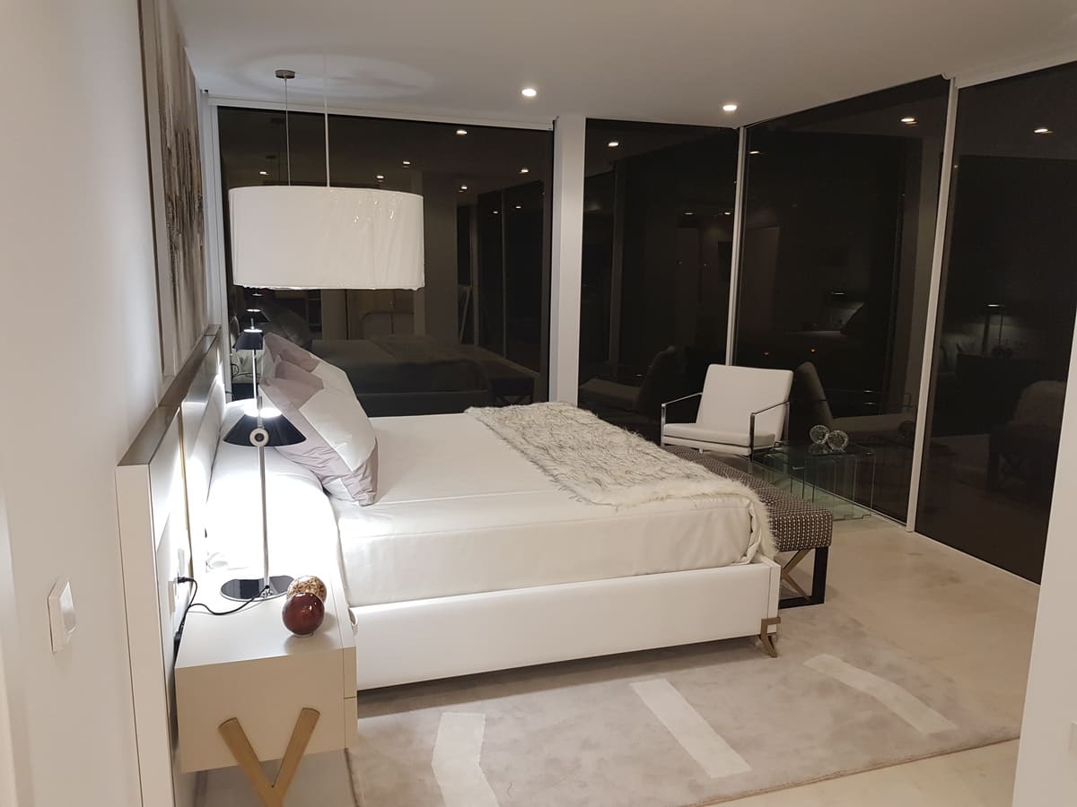Apartamento con un diseño abierto y luminoso. La sala de estar y la cocina comparten un espacio diáfano, dominado por grandes ventanales de vidrio que permiten la entrada abundante de luz natural y ofrecen vistas panorámicas del entorno exterior. La cocina, con una isla central de diseño minimalista y superficies blancas pulidas, está equipada con electrodomésticos integrados y elegantes lámparas colgantes. La sala de estar cuenta con muebles contemporáneos en tonos marrones y neutros, creando un ambiente acogedor y elegante. Los suelos claros y las paredes blancas amplifican la sensación de amplitud y luminosidad, mientras que elementos decorativos sutiles y plantas aportan un toque de calidez y vida al espacio.