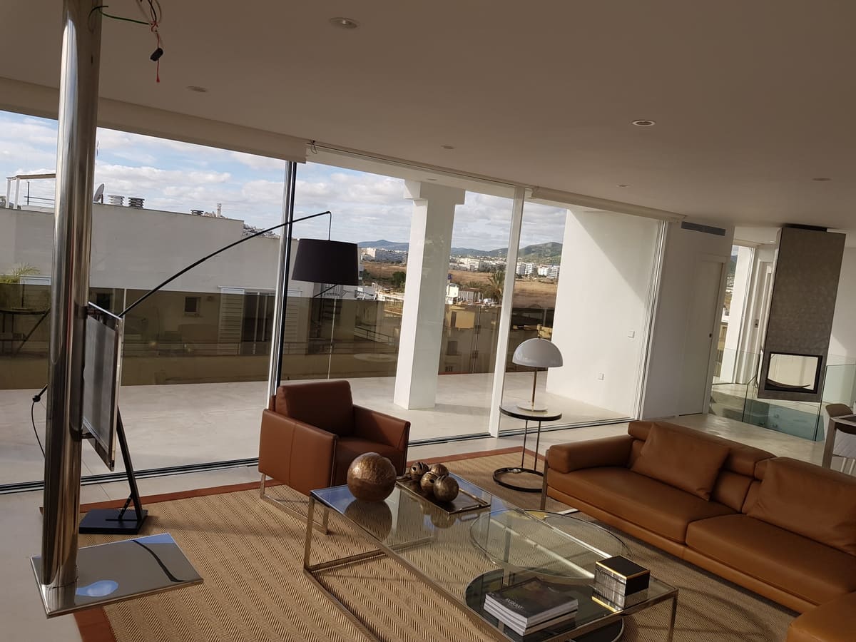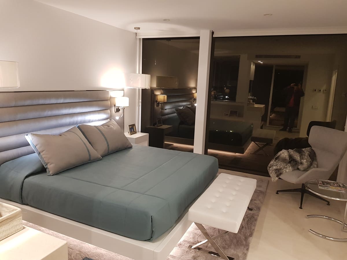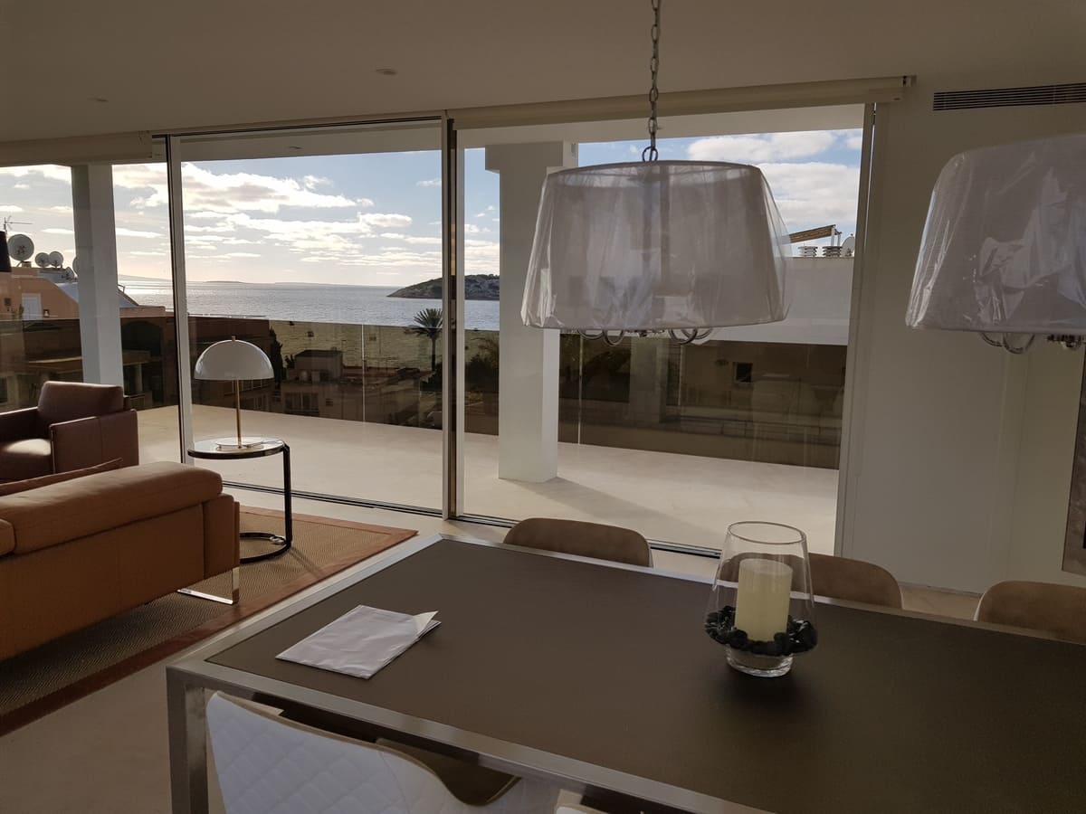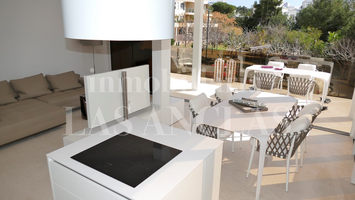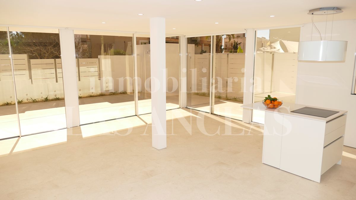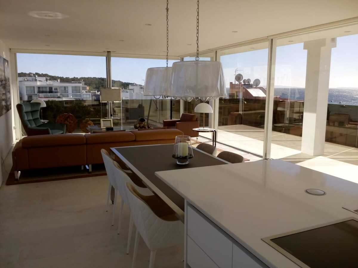 Apartamento con un diseño abierto y luminoso. La sala de estar y la cocina comparten un espacio diáfano, dominado por grandes ventanales de vidrio que permiten la entrada abundante de luz natural y ofrecen vistas panorámicas del entorno exterior. La cocina, con una isla central de diseño minimalista y superficies blancas pulidas, está equipada con electrodomésticos integrados y elegantes lámparas colgantes. La sala de estar cuenta con muebles contemporáneos en tonos marrones y neutros, creando un ambiente acogedor y elegante. Los suelos claros y las paredes blancas amplifican la sensación de amplitud y luminosidad, mientras que elementos decorativos sutiles y plantas aportan un toque de calidez y vida al espacio.