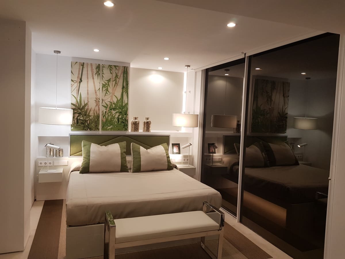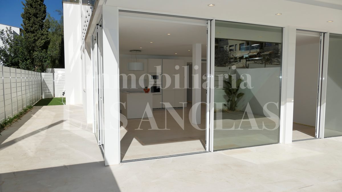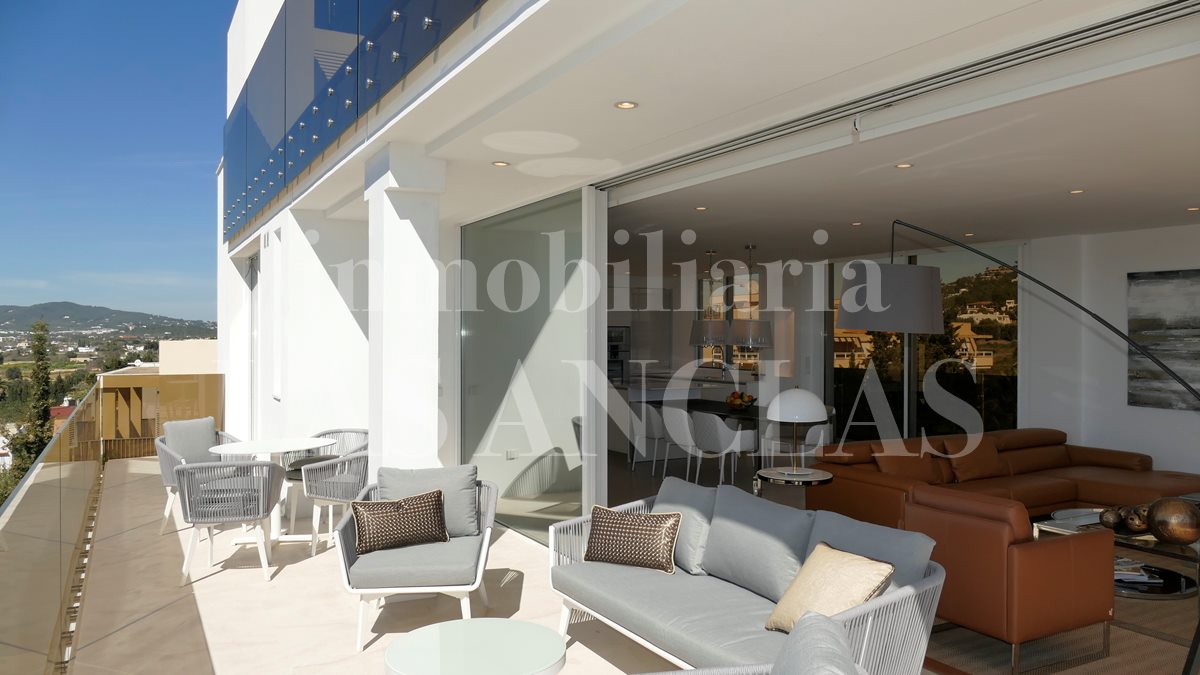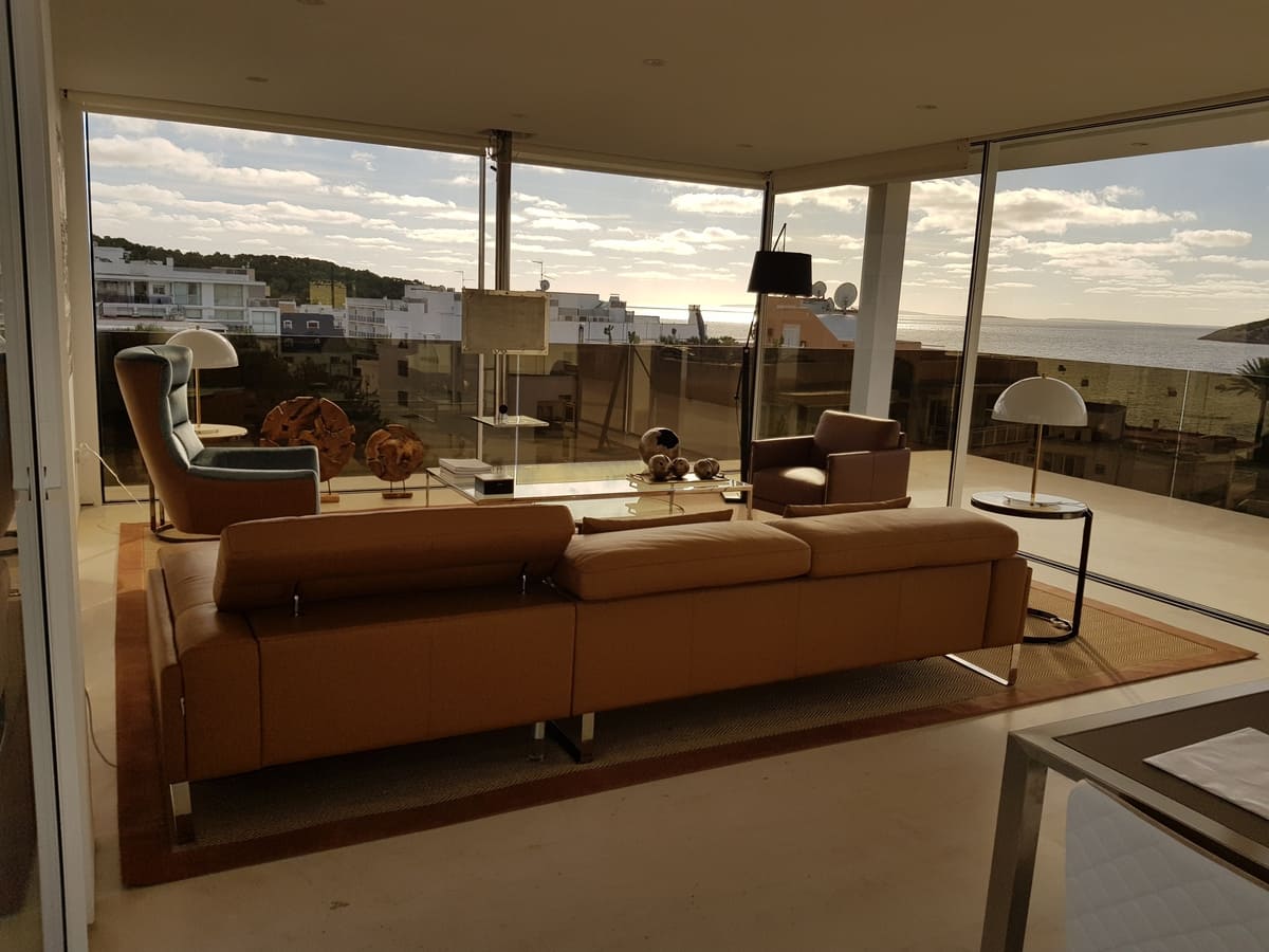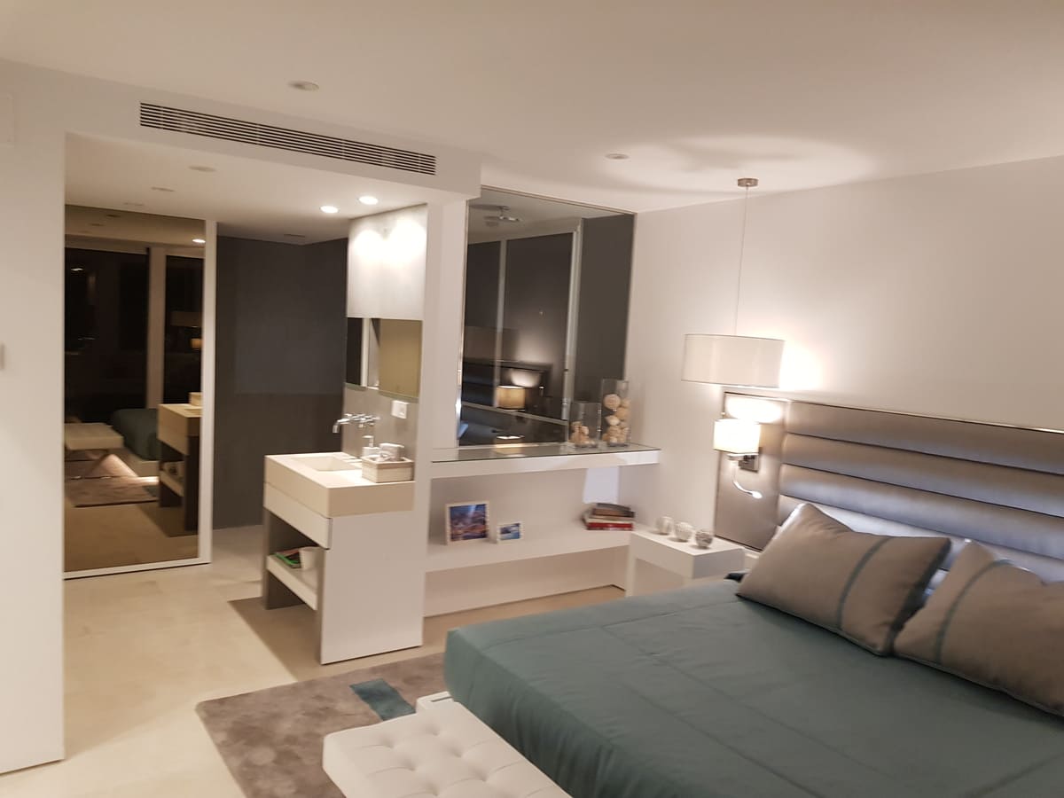 Apartamento con un diseño abierto y luminoso. La sala de estar y la cocina comparten un espacio diáfano, dominado por grandes ventanales de vidrio que permiten la entrada abundante de luz natural y ofrecen vistas panorámicas del entorno exterior. La cocina, con una isla central de diseño minimalista y superficies blancas pulidas, está equipada con electrodomésticos integrados y elegantes lámparas colgantes. La sala de estar cuenta con muebles contemporáneos en tonos marrones y neutros, creando un ambiente acogedor y elegante. Los suelos claros y las paredes blancas amplifican la sensación de amplitud y luminosidad, mientras que elementos decorativos sutiles y plantas aportan un toque de calidez y vida al espacio.