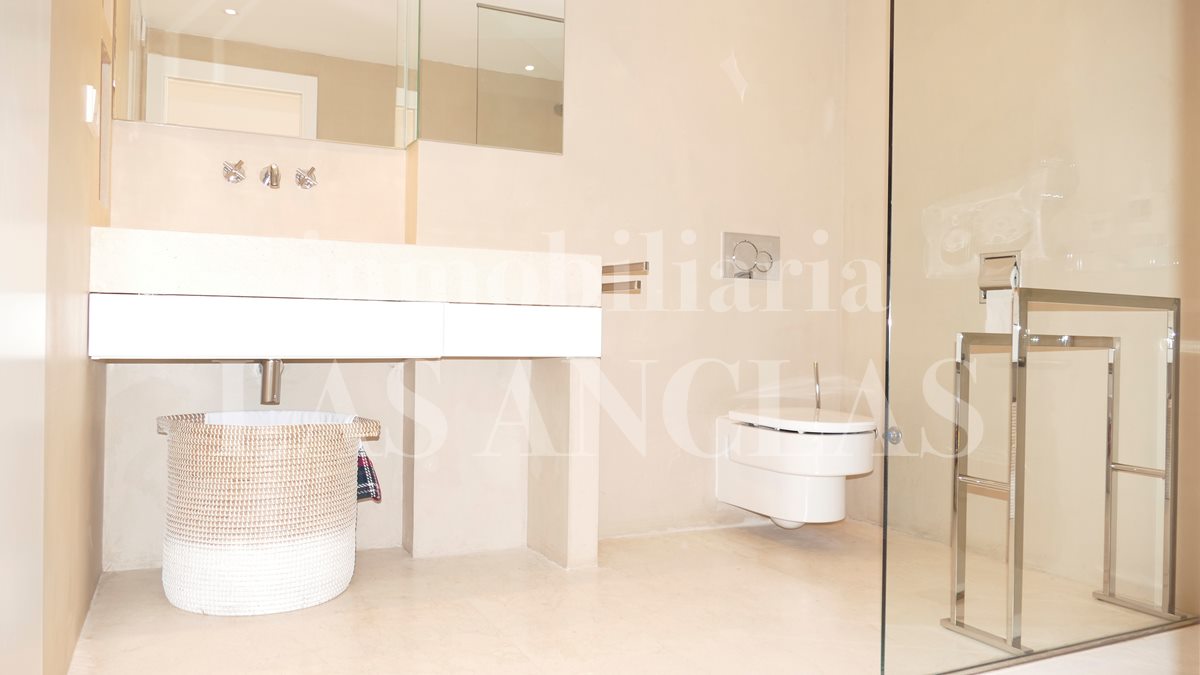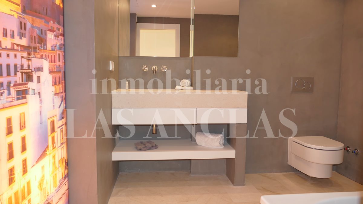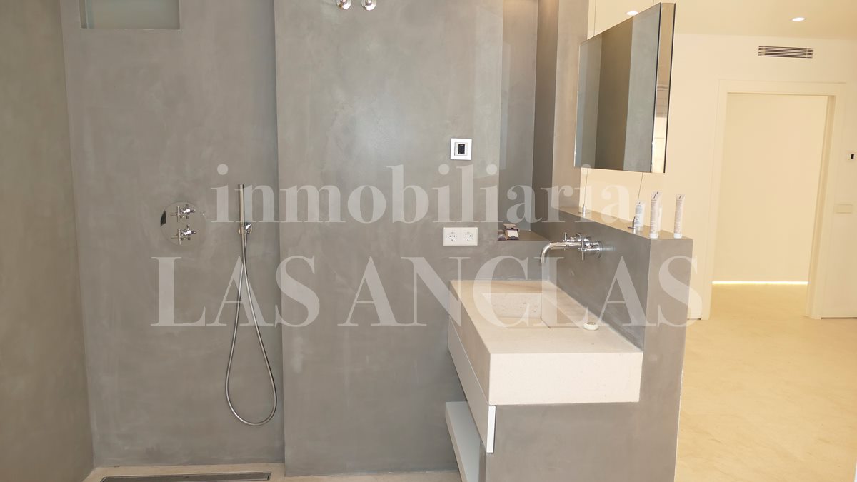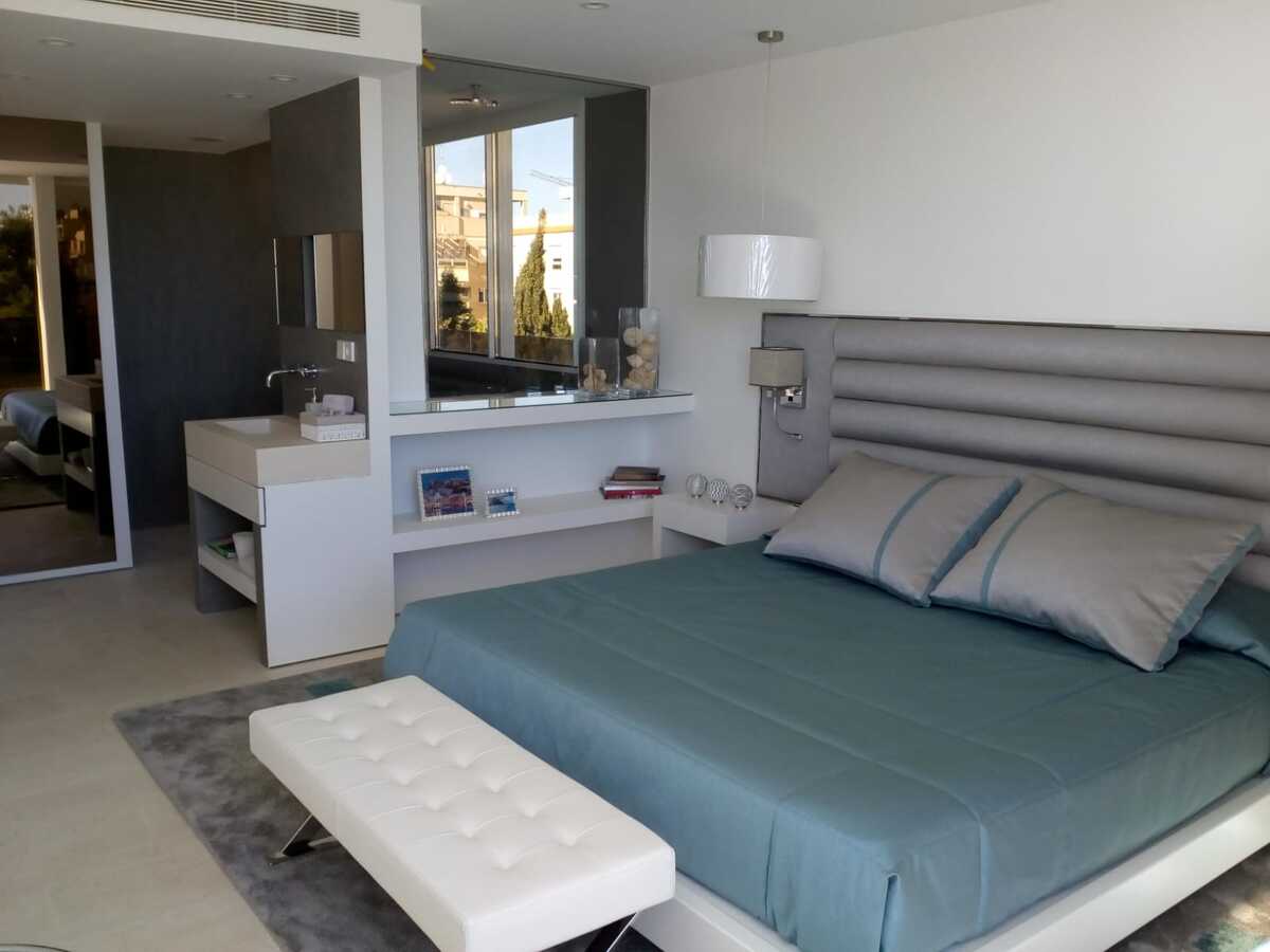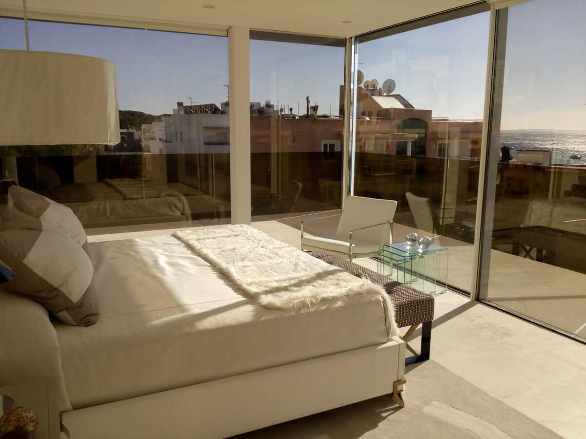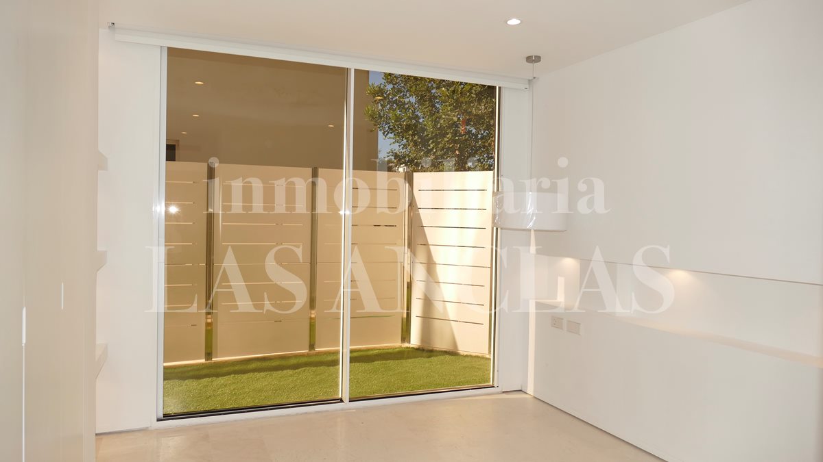 Apartamento con un diseño abierto y luminoso. La sala de estar y la cocina comparten un espacio diáfano, dominado por grandes ventanales de vidrio que permiten la entrada abundante de luz natural y ofrecen vistas panorámicas del entorno exterior. La cocina, con una isla central de diseño minimalista y superficies blancas pulidas, está equipada con electrodomésticos integrados y elegantes lámparas colgantes. La sala de estar cuenta con muebles contemporáneos en tonos marrones y neutros, creando un ambiente acogedor y elegante. Los suelos claros y las paredes blancas amplifican la sensación de amplitud y luminosidad, mientras que elementos decorativos sutiles y plantas aportan un toque de calidez y vida al espacio.