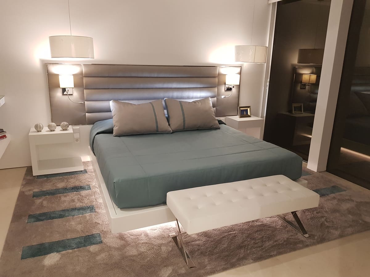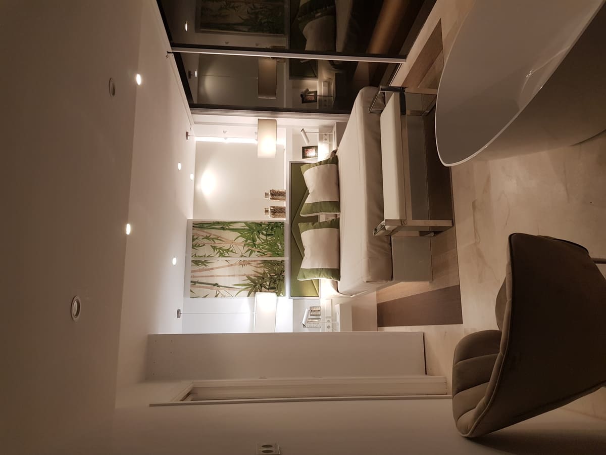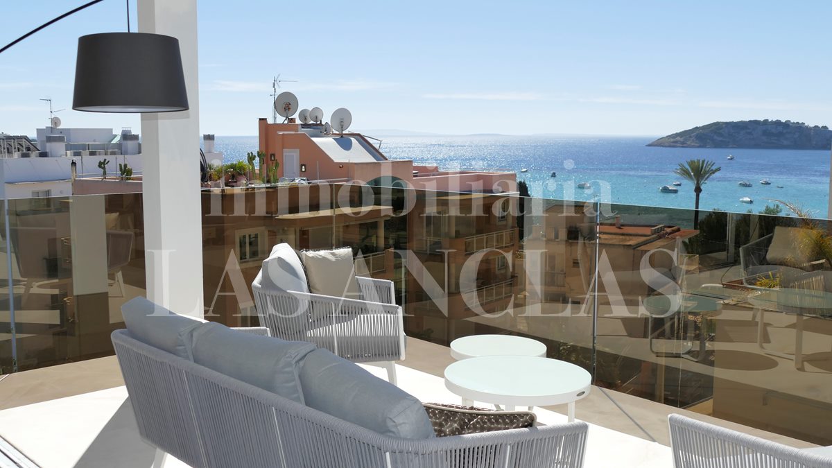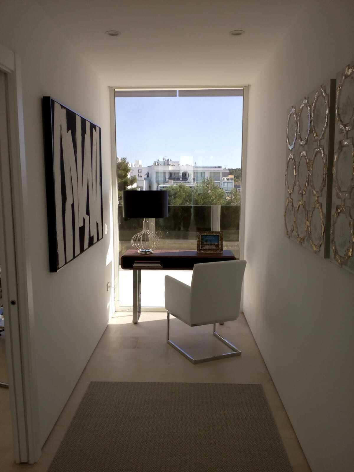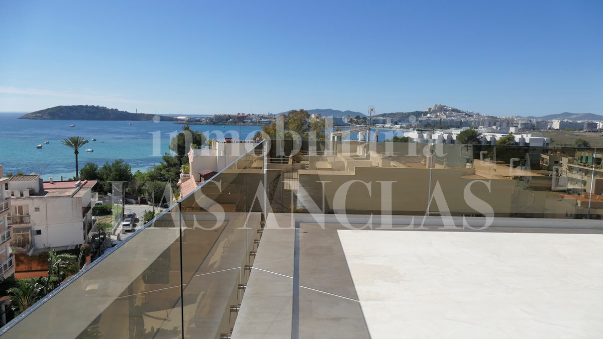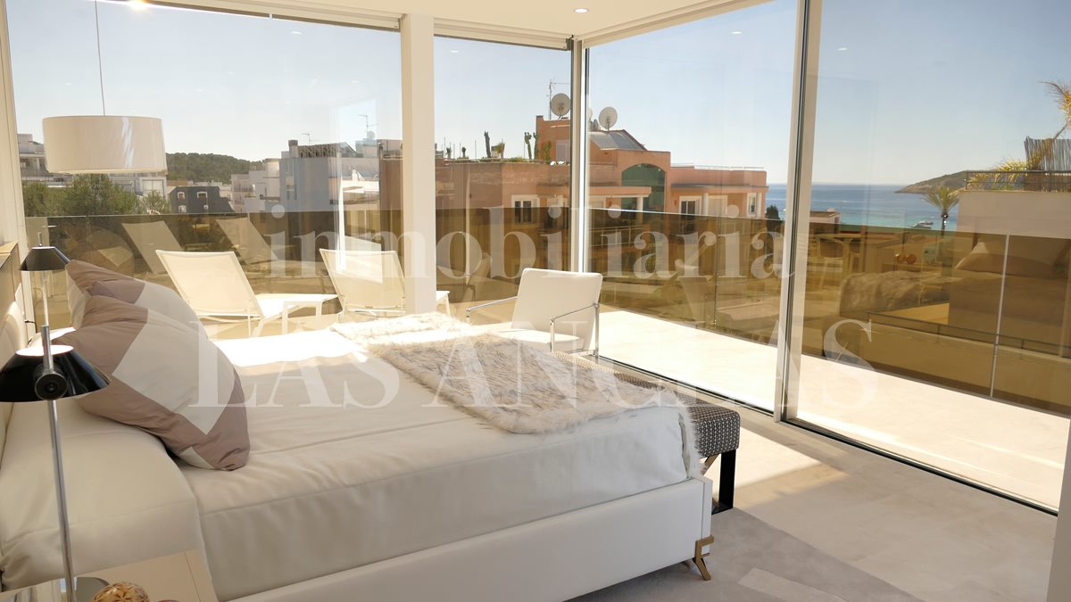 Apartamento con un diseño abierto y luminoso. La sala de estar y la cocina comparten un espacio diáfano, dominado por grandes ventanales de vidrio que permiten la entrada abundante de luz natural y ofrecen vistas panorámicas del entorno exterior. La cocina, con una isla central de diseño minimalista y superficies blancas pulidas, está equipada con electrodomésticos integrados y elegantes lámparas colgantes. La sala de estar cuenta con muebles contemporáneos en tonos marrones y neutros, creando un ambiente acogedor y elegante. Los suelos claros y las paredes blancas amplifican la sensación de amplitud y luminosidad, mientras que elementos decorativos sutiles y plantas aportan un toque de calidez y vida al espacio.