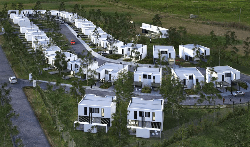Residencial moderno compuesto por múltiples viviendas unifamiliares dispuestas en un patrón curvilíneo que sigue el contorno del terreno. Las casas tienen un diseño contemporáneo con líneas limpias y formas cúbicas, predominando los colores blancos y neutros que resaltan en el entorno natural.